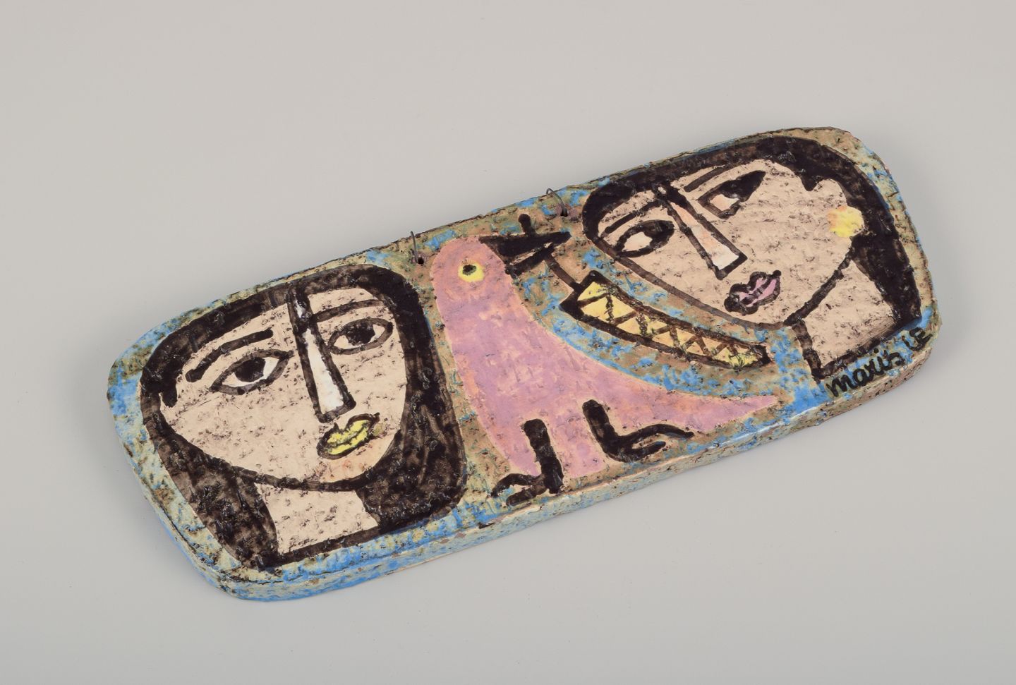 Polykrom glasur. Motiv af kvindeansigter og lyserød fugl.