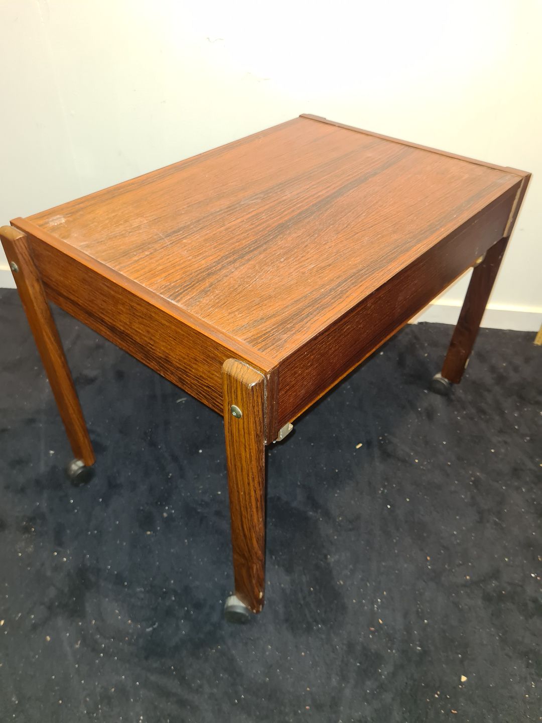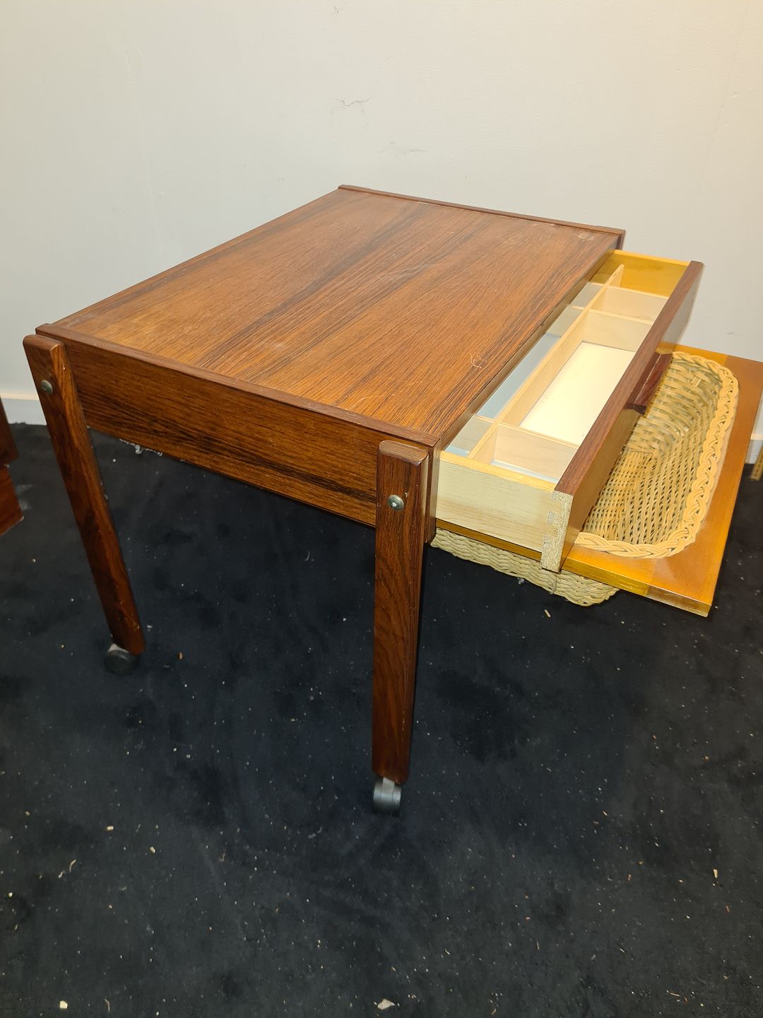 Sybord fra 1970´erne i palisander og med kurv og skuffe. Fremstår pænt og velholdt uden de store brugsspor.