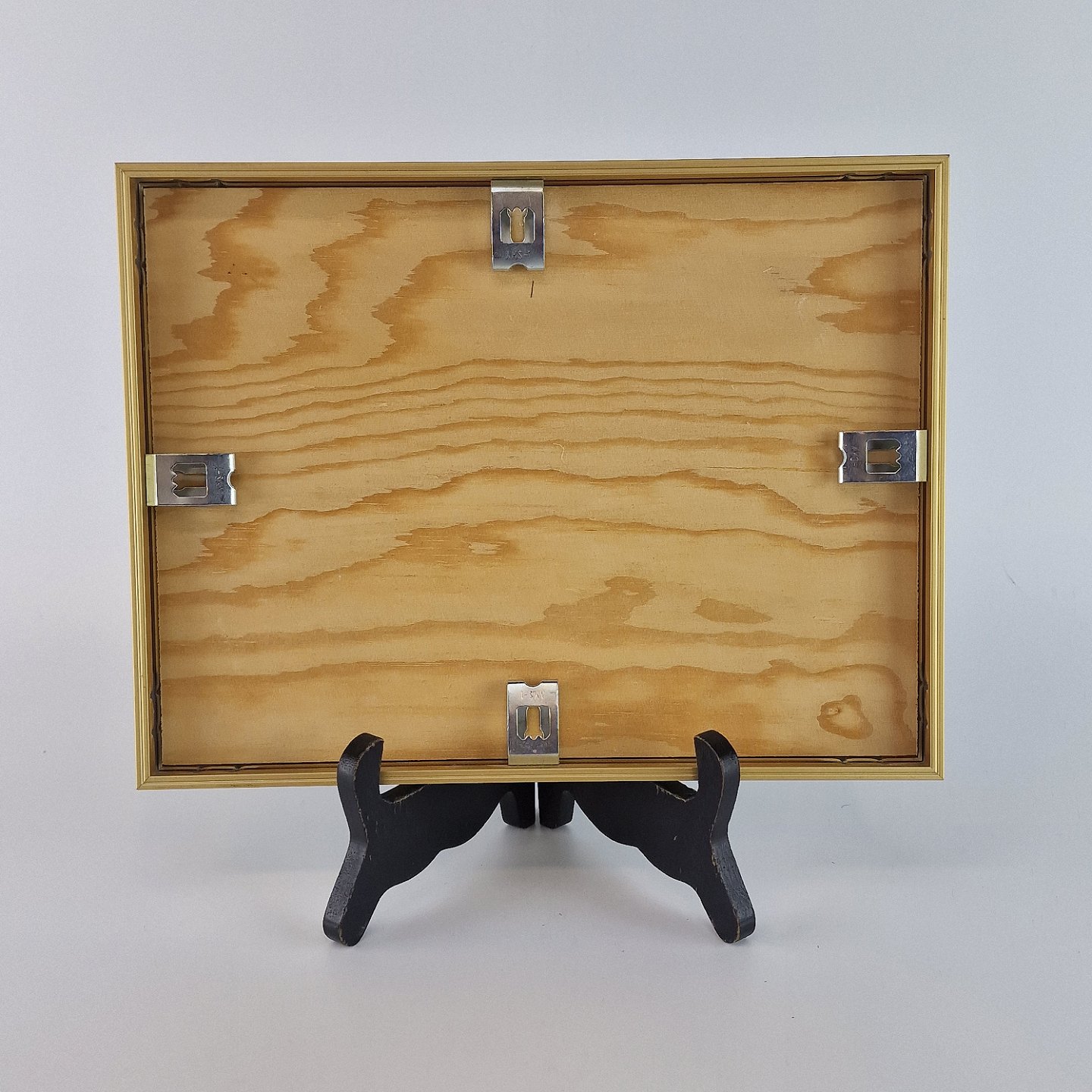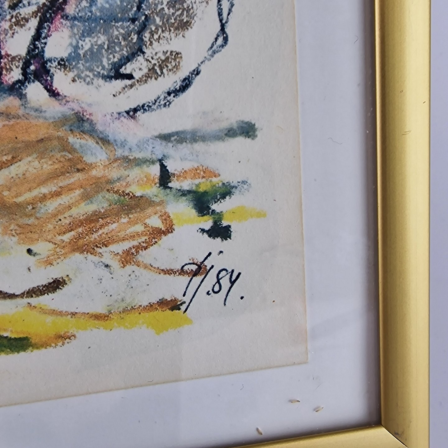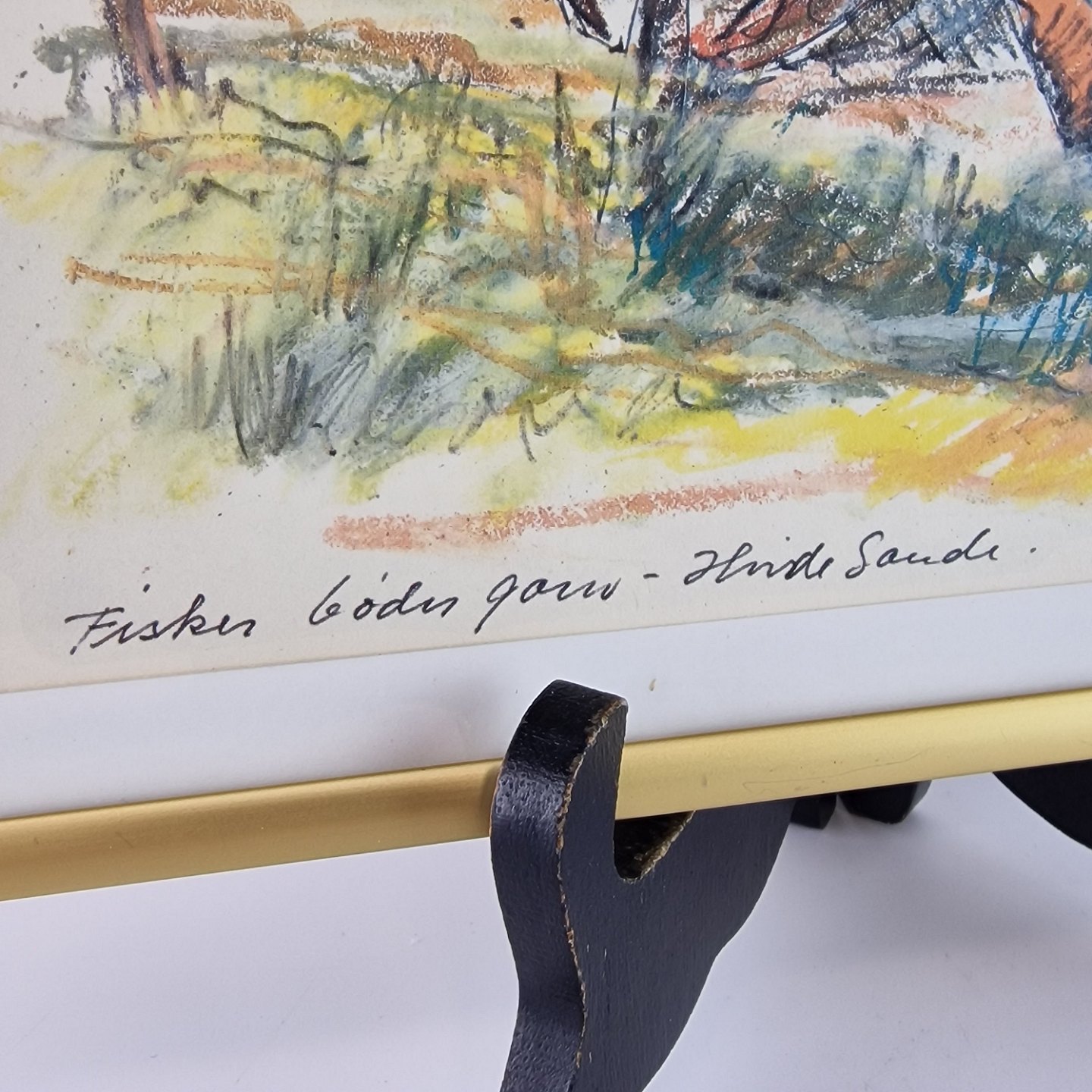 Indrammet tegning i oliekridt i gylden aluminiumsramme med landskabsmotiv af klitområde ved Hvidesande, hvor en fisker ordner garn.