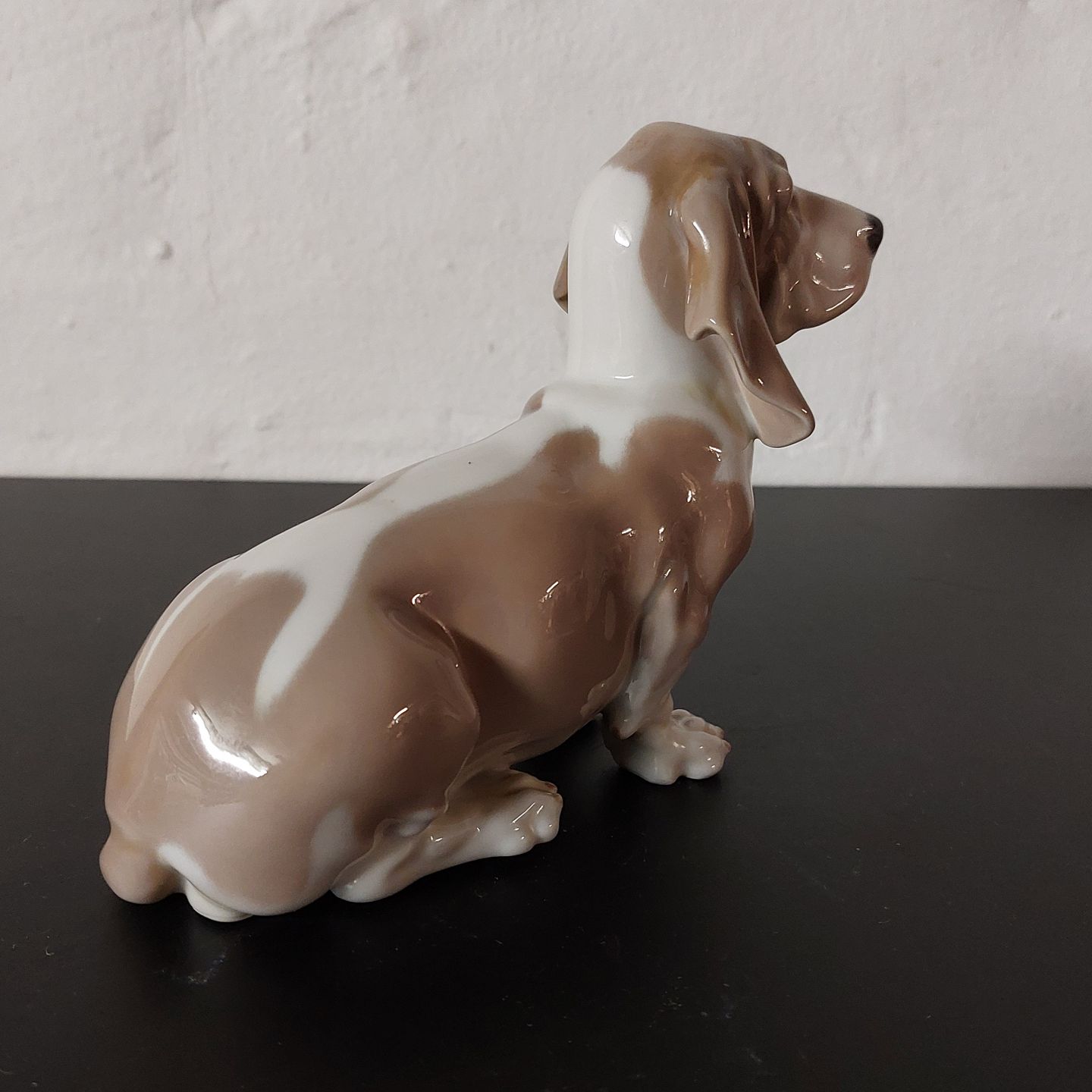 Figur af basset hund i porcelæn fra Royal Copenhagen. Designet af Jeanne Grut. Fremstår i god stand uden skader eller reparationer. Modelnummer 356. 1. Sortering. Fabriksmærket på bunden. Mål: H. 12,5 cm samt.15.cm lang.