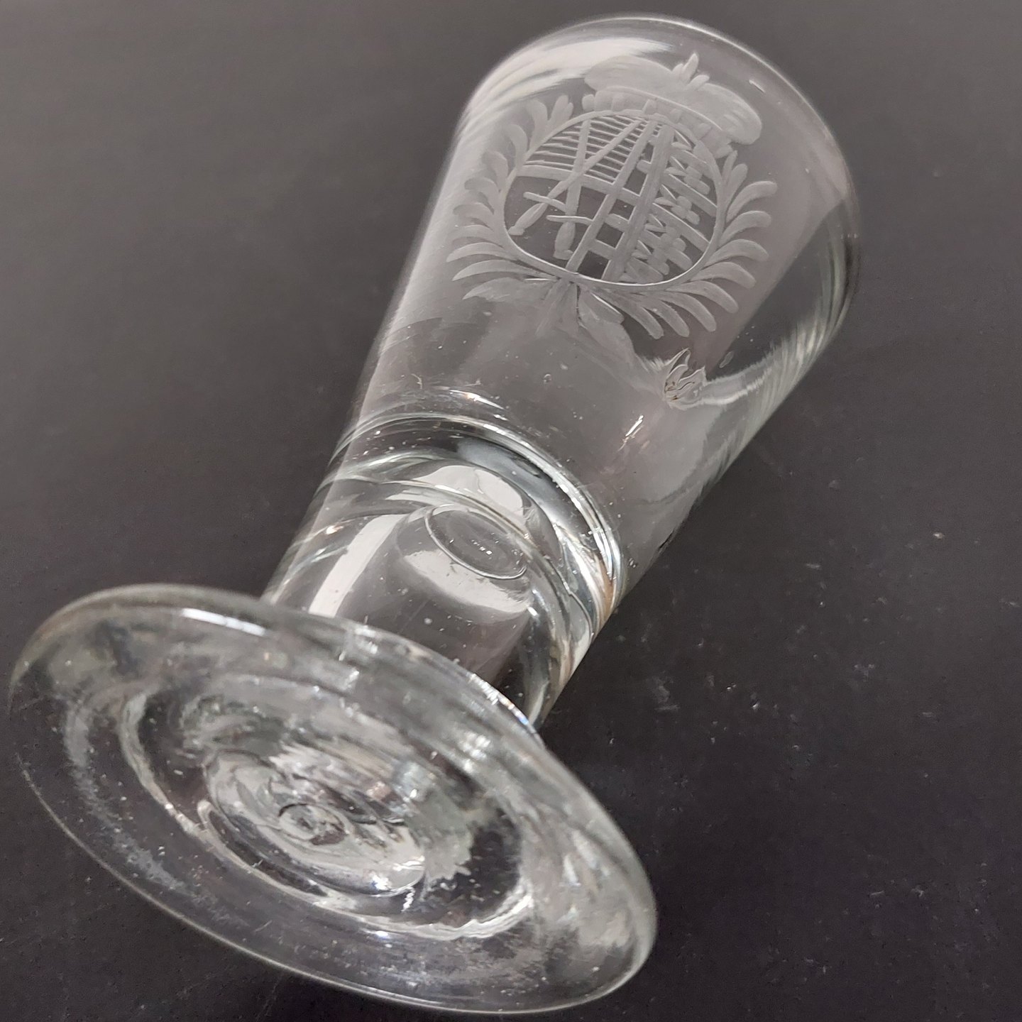 Glas til vin med hul stilk og indgraveret adelig monogram. Fremstillet I 19. århundrede formodentligt i Tyskland. I god stand uden skader eller reparationer. H. 10,5 cm