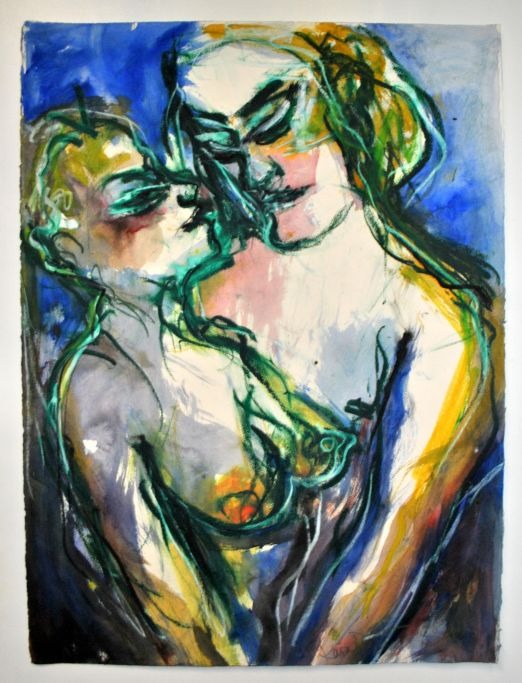 Degett, Karen (1954 - 2011) Danmark: Et ungt par. Pastel/akvarel på papir. Signeret. 76 x 55 cm.