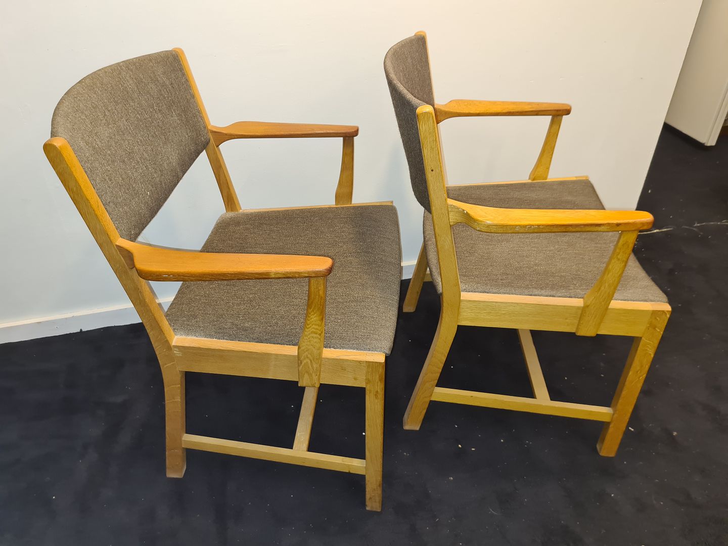 2 Armstole i eg med armlæn i teak og uldbetrukket ryg og sæde. Fremstår og pæne og velholdte dog med lettere brugsspor på betrækket,