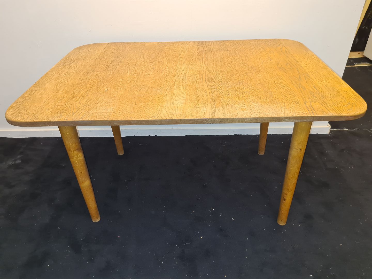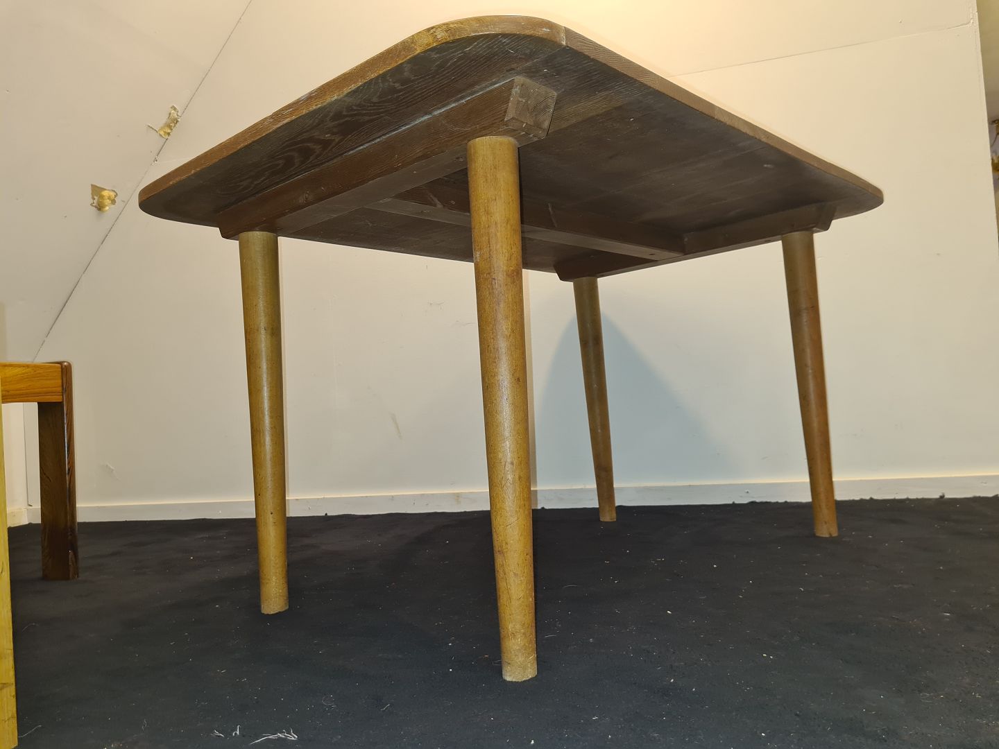 Spisebord med plade i massiv eg. Fremstår pænt dog med brugsspor i form af revne i pladen (billede) og lettere vakkelvorn.