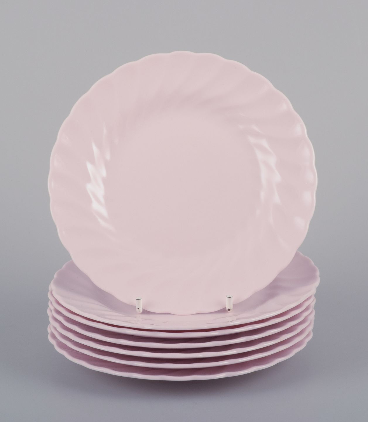 Tuscan, England. Seven plates in light pink porcelain with a wavy edge.