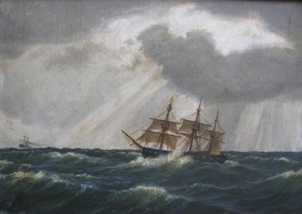 Dansk kunstner (19. årh.): Skibe i Nordsøen. Olie på pap. 25 x 35 cm. På bagsiden anført: Efter Carl Baagø. Skibet er en russisk fregat med Sankt Andreas flaget.