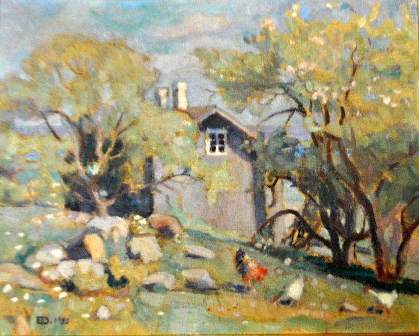 Danielsson, Emil (1882 - 1967) Finland: Høns ved en gård. Olie på lærred. Signeret monogram 1933. 40,5 x 51 cm.