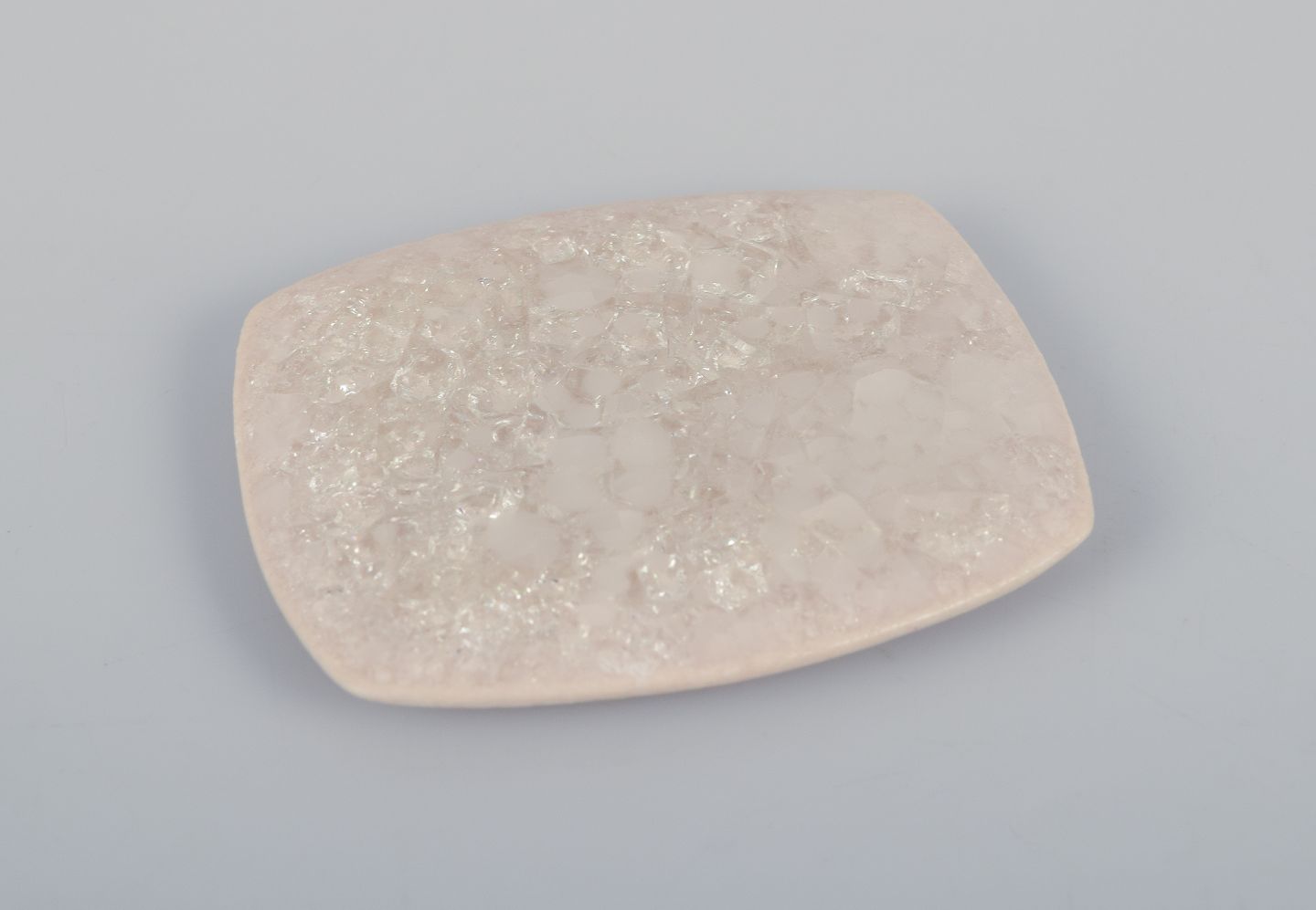 Seks unika brocher i glaseret stentøj i blå og hvide nuancer.