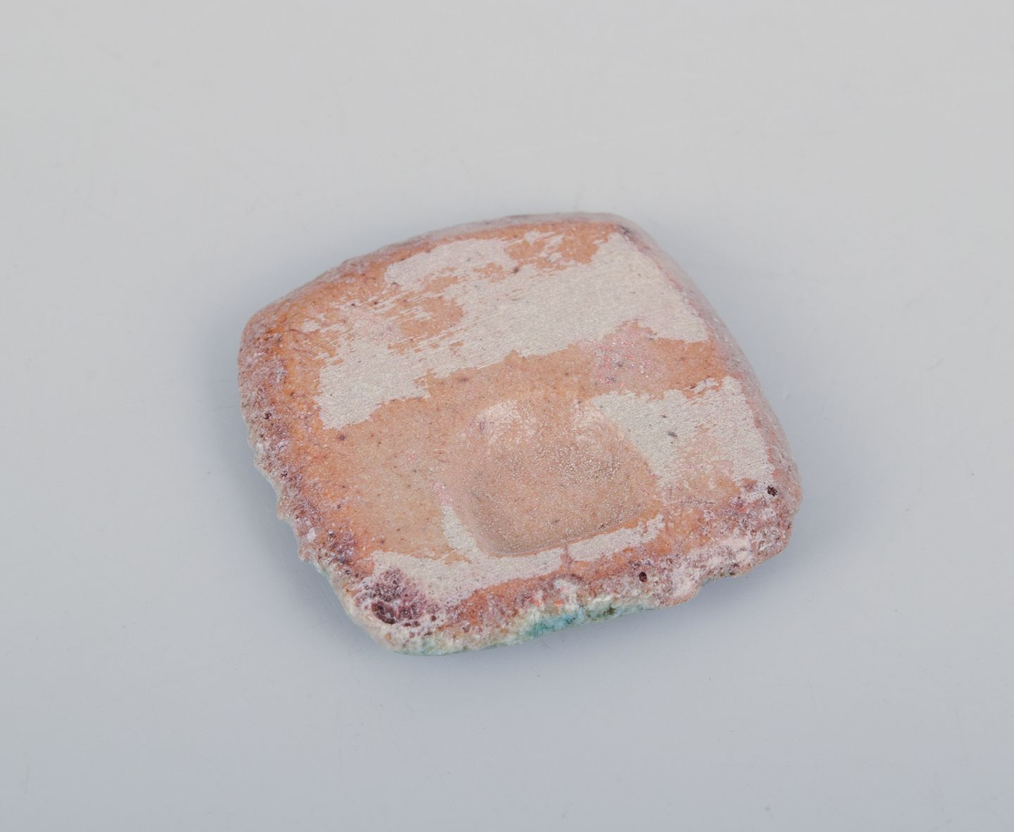 Otte unika brocher i glaseret stentøj i forskellige nuancer.