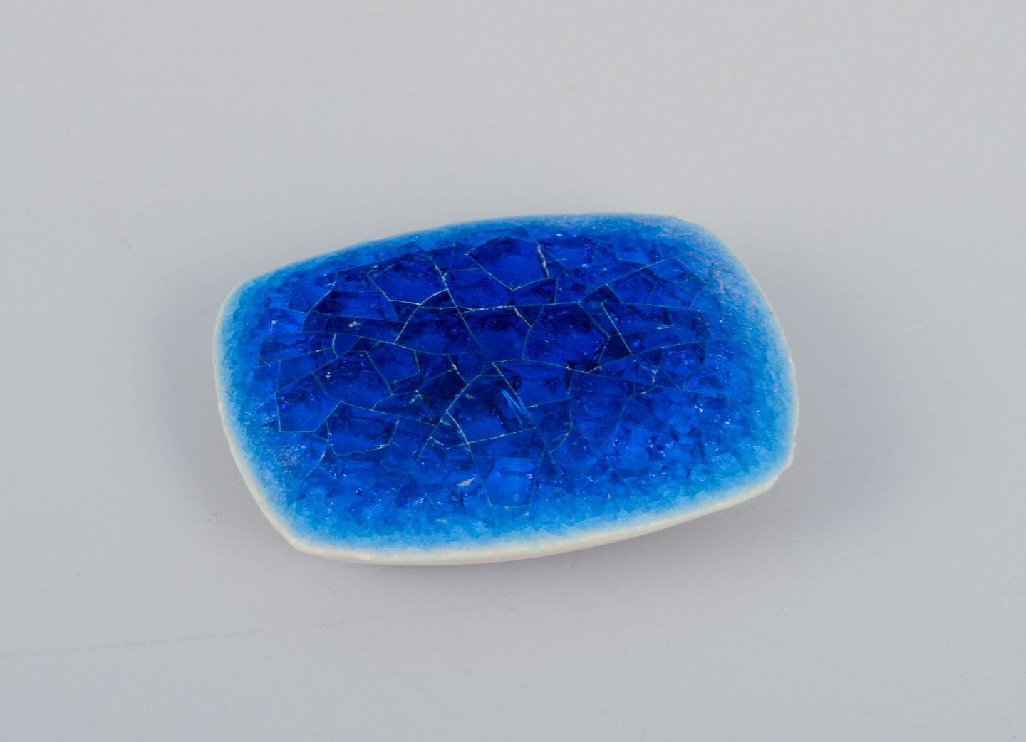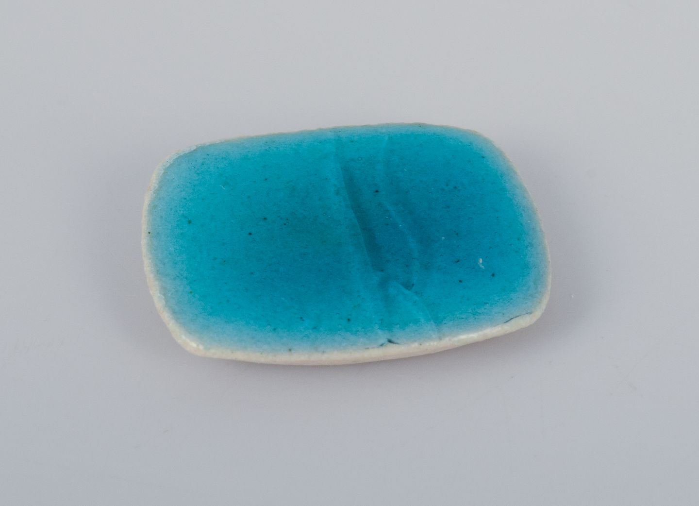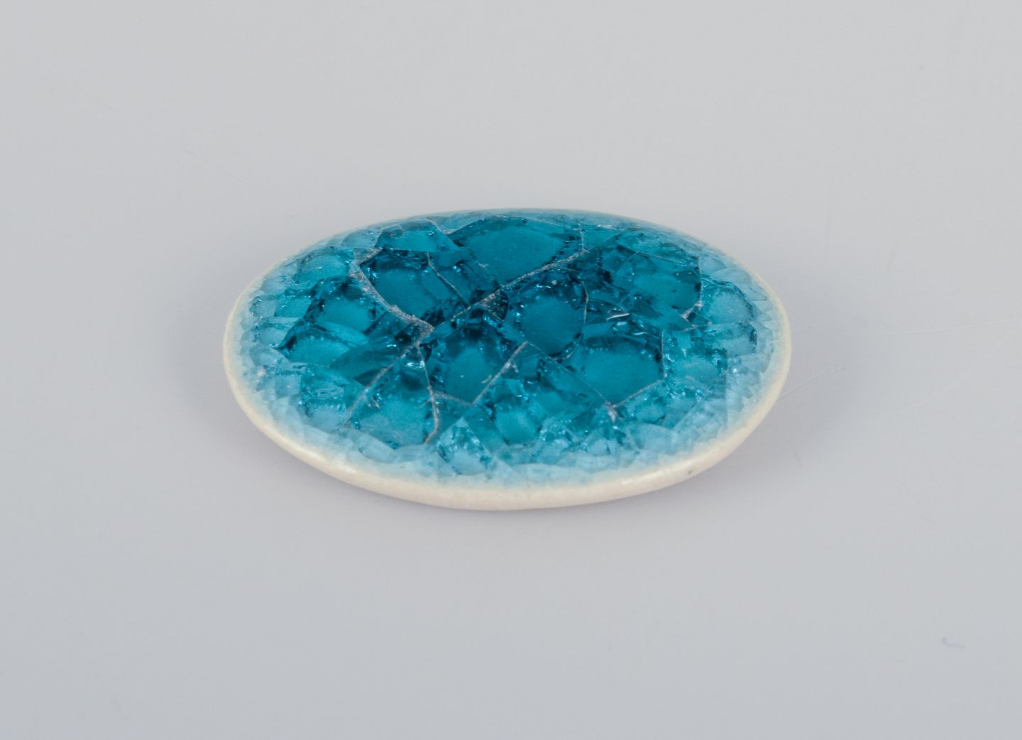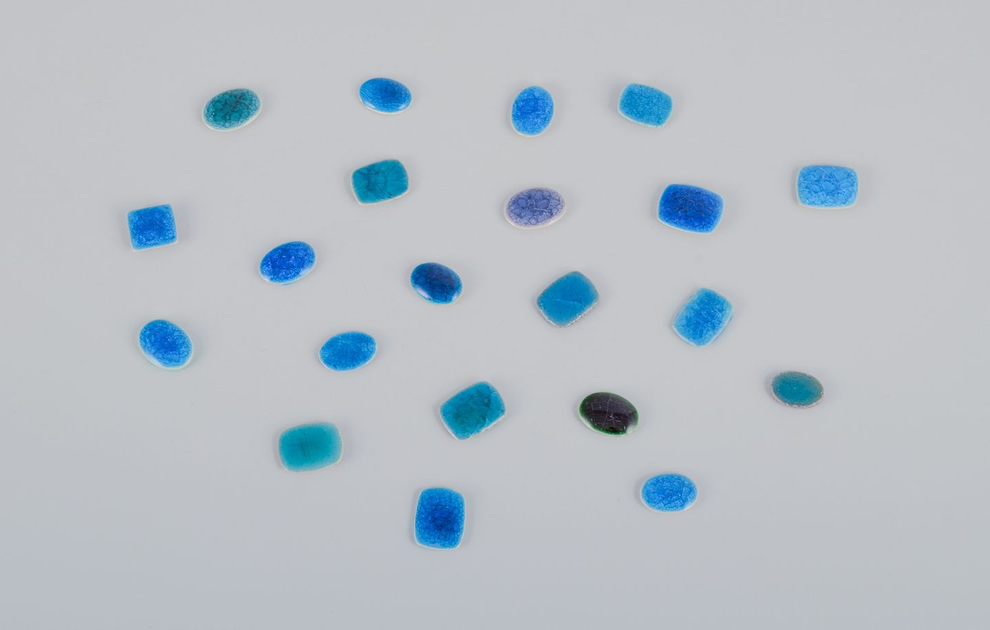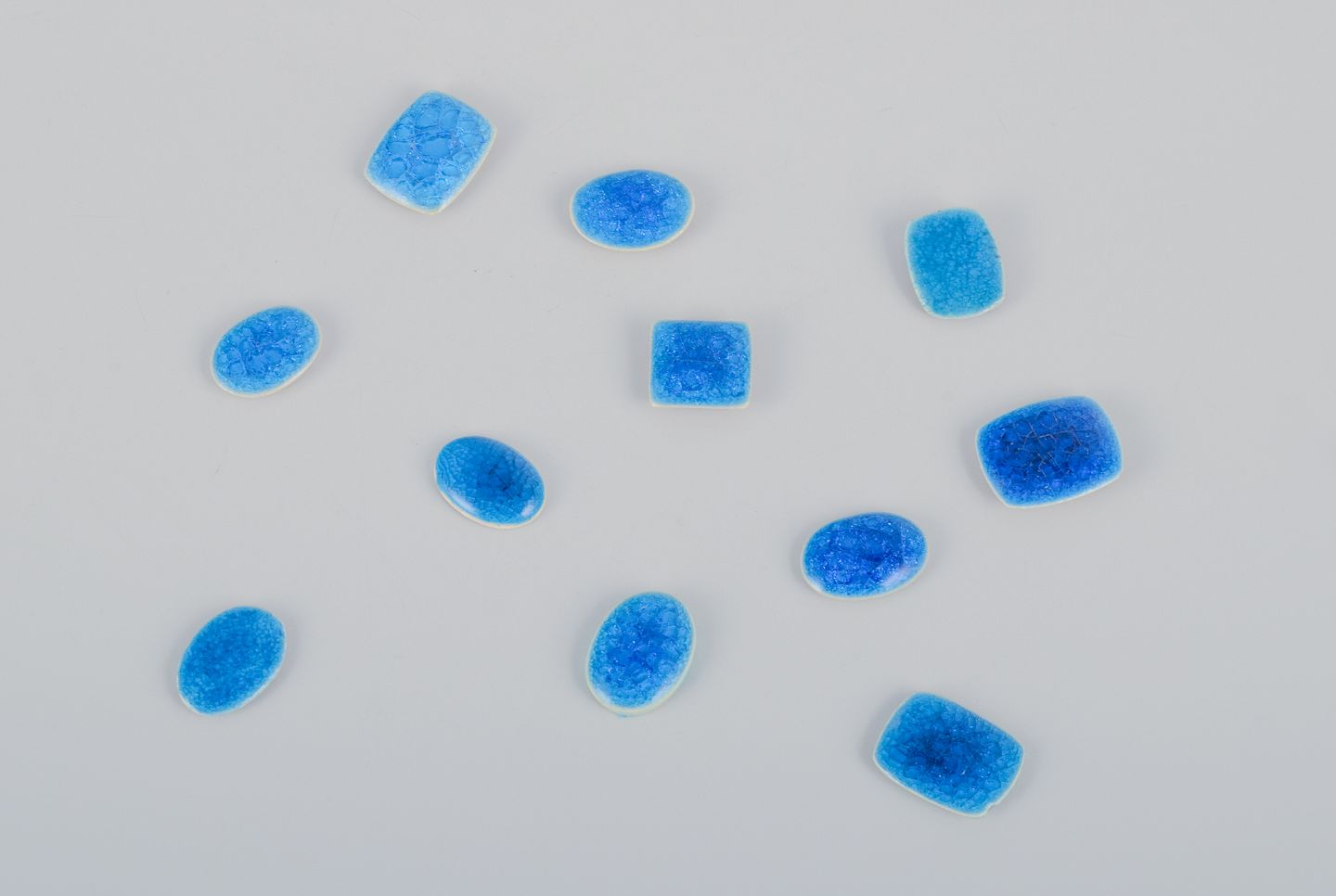 Tyve unika brocher i glaseret stentøj i blå og turkise nuancer.