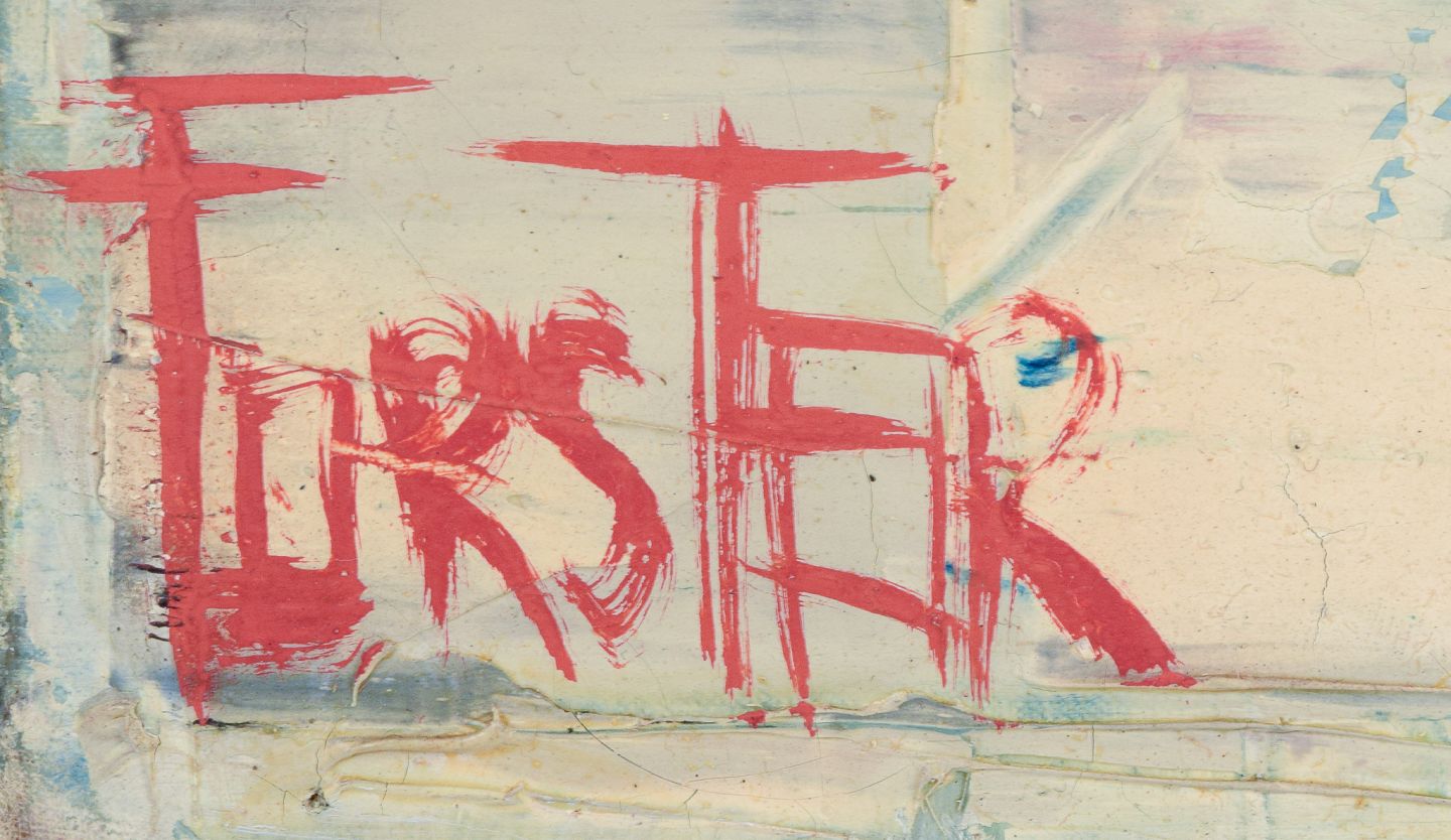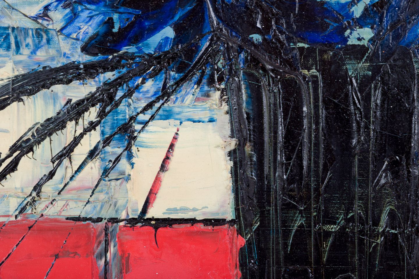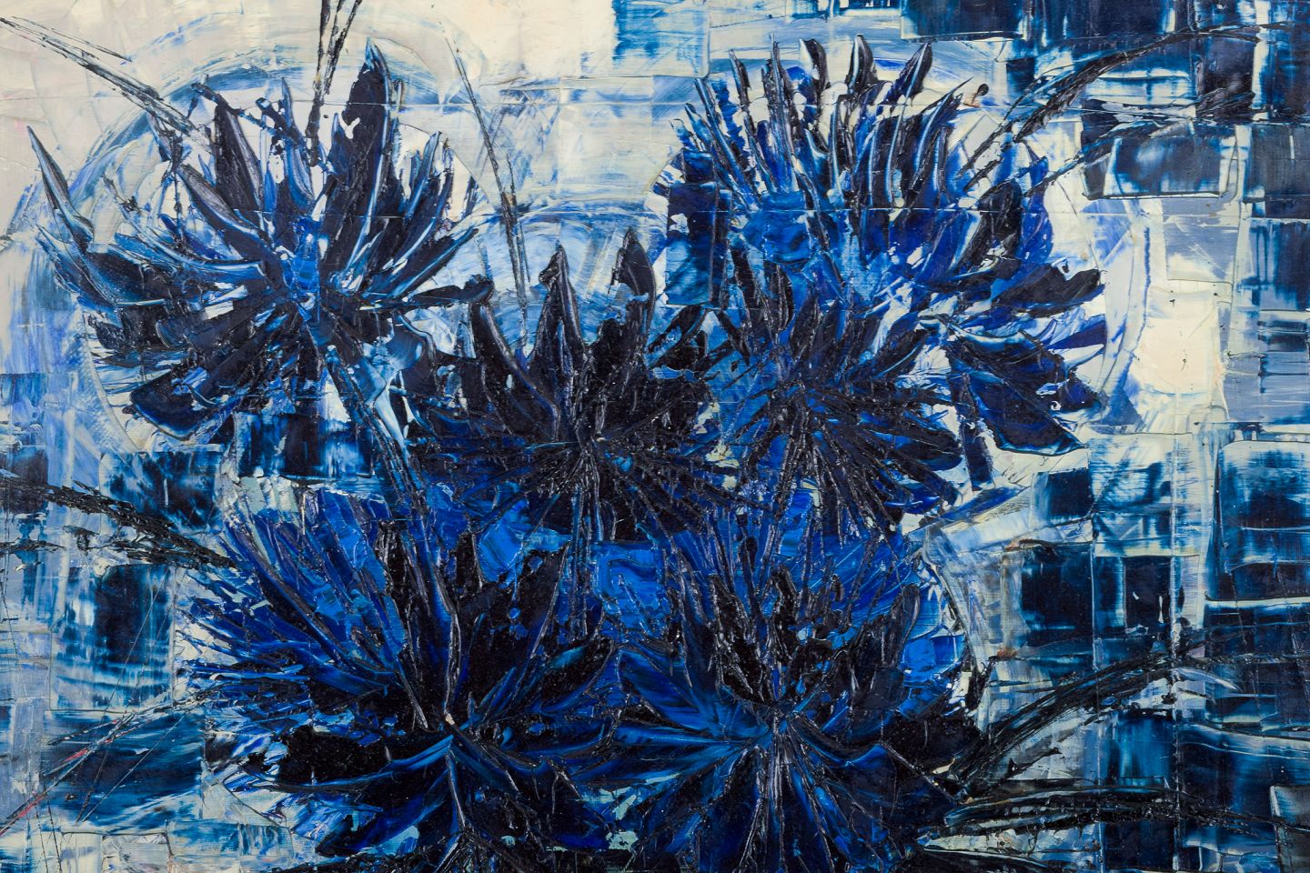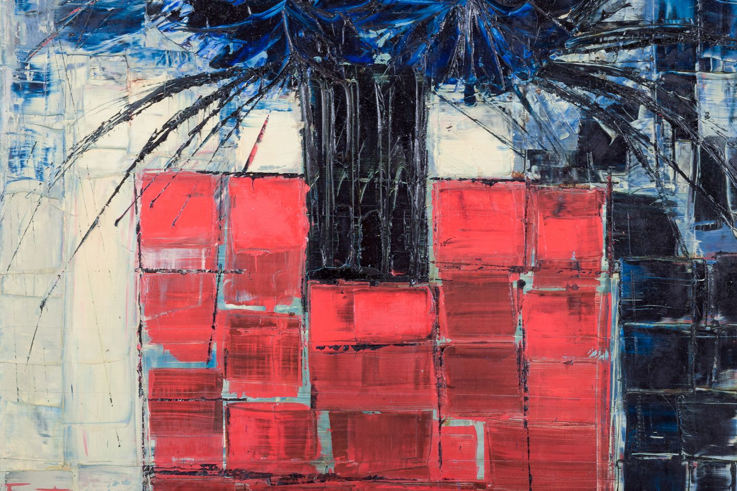Blomster i vase. Abstrakt stil. Blå og rød palette.