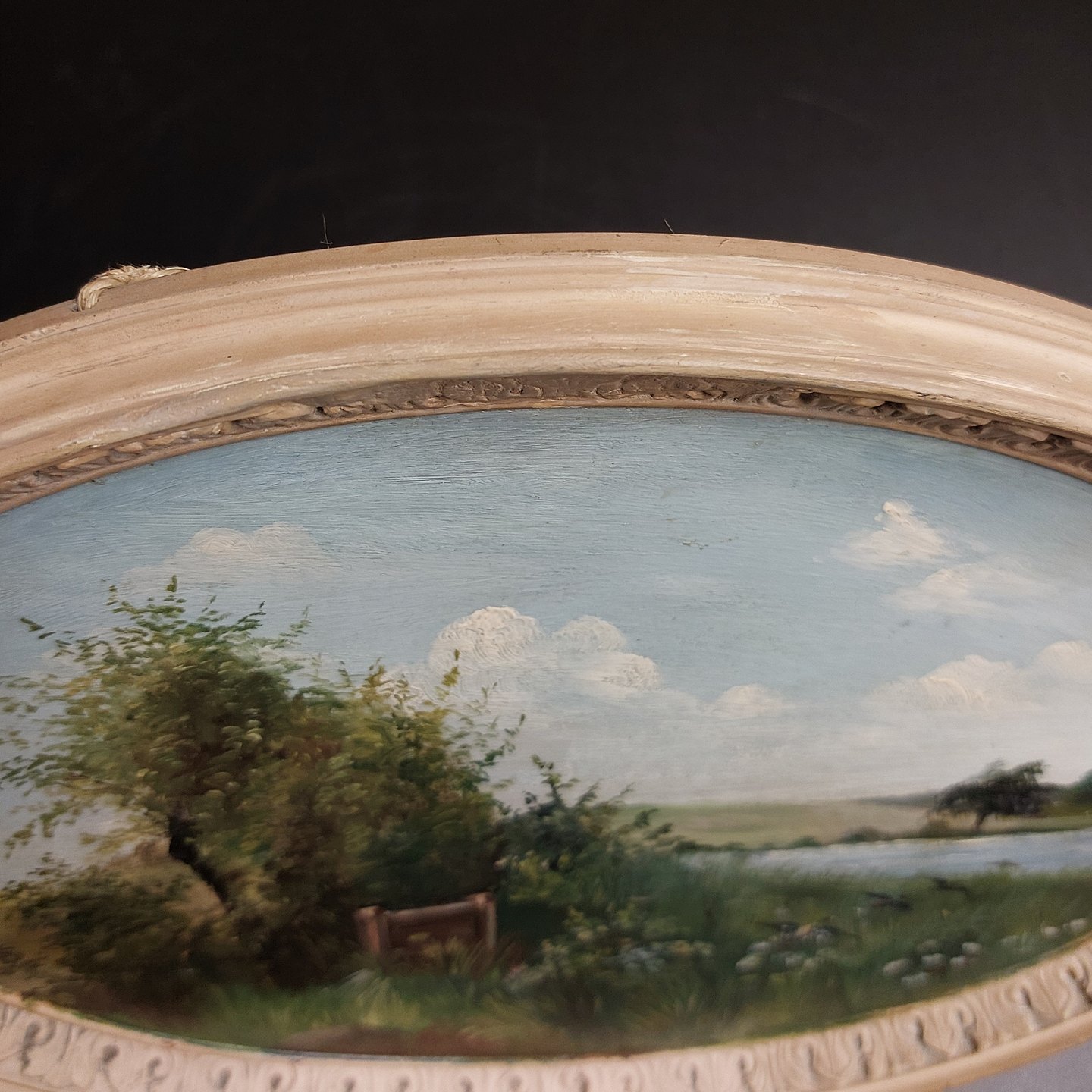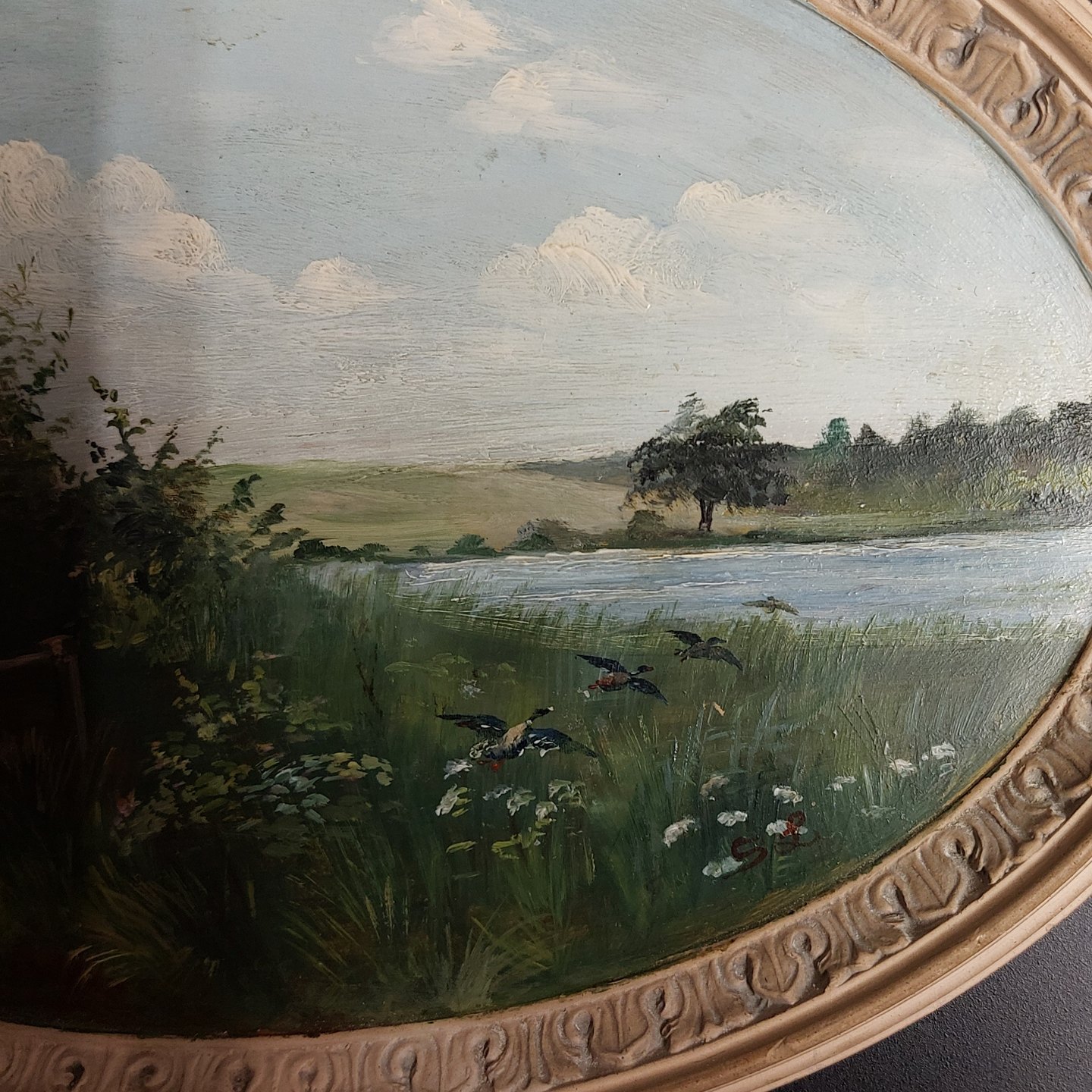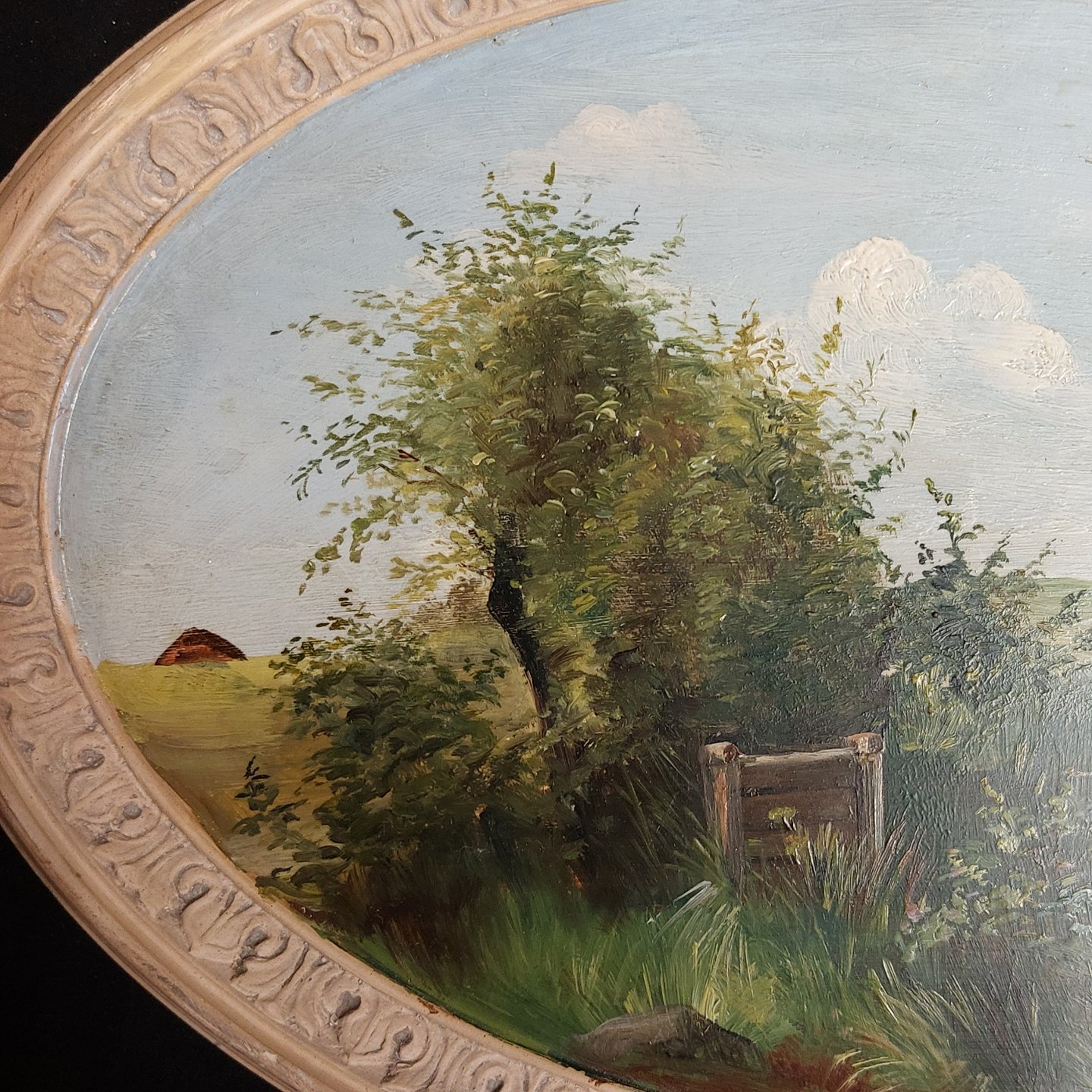 Maleri på oval plade. Bemalet landskabsmotiv på terracotta platte fra Peter Ipsen, København, ca. 1900. Platten har en reparation øverst på kanten. Se fotos med pilen. Fabriksmærket på bagsiden. Mål: 19.5 x 29 cm