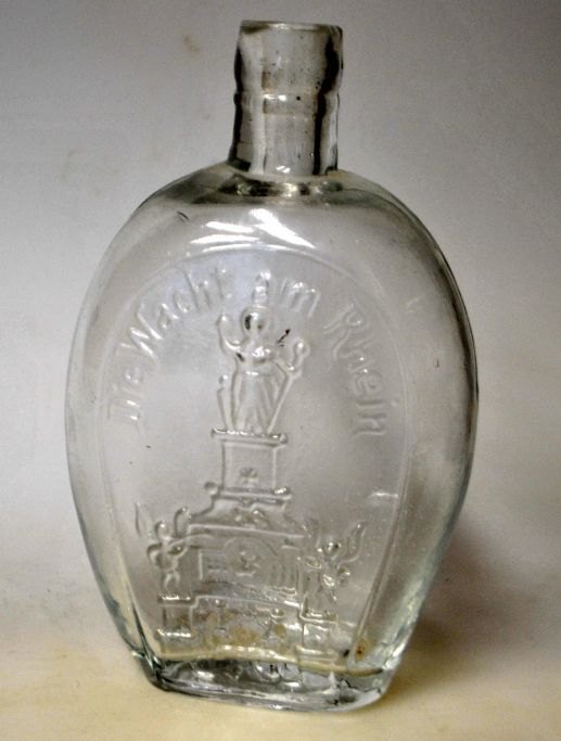Tysk lommelærke i klart glas, 19. årh. Med motiv og teksten: Die Wacht am Rhein. H.: 12,5 cm. 1/8 L.