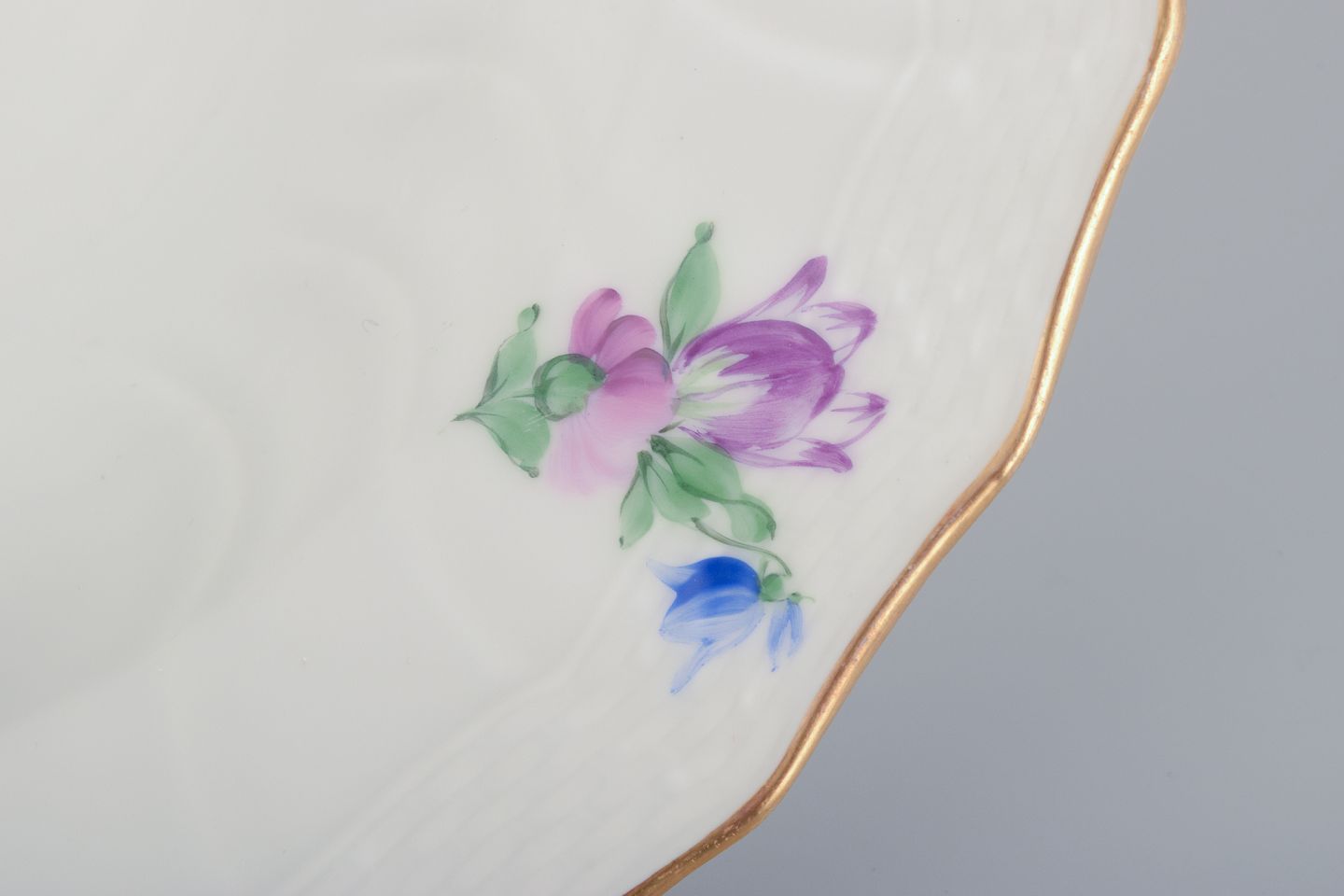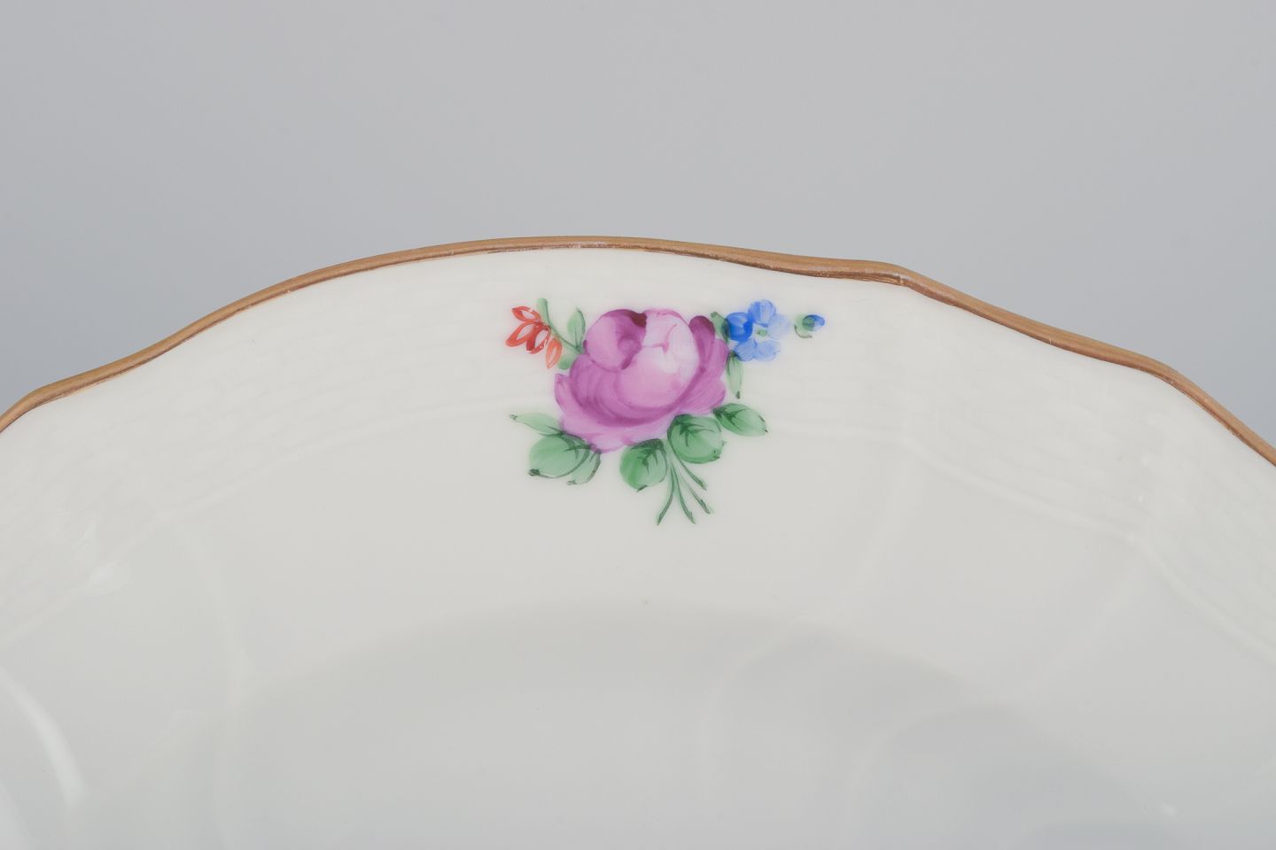 Royal Copenhagen Saksisk Blomst. Fire dybe tallerkner i porcelæn. Håndmalet med polykrome blomster. Guldkant.