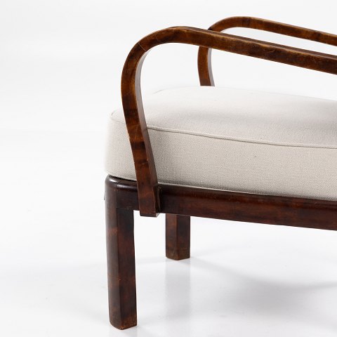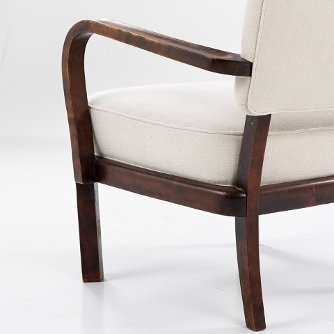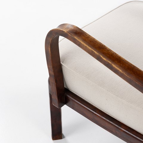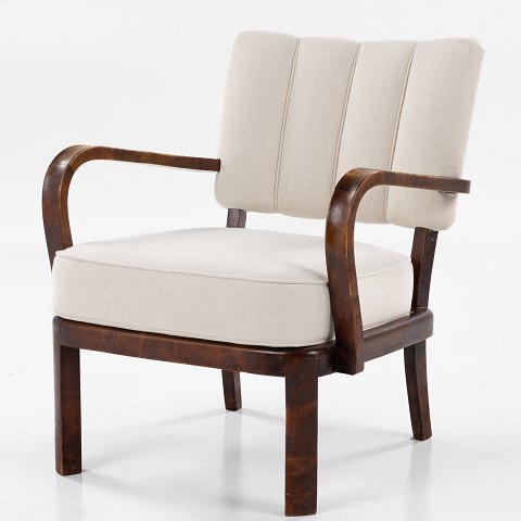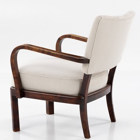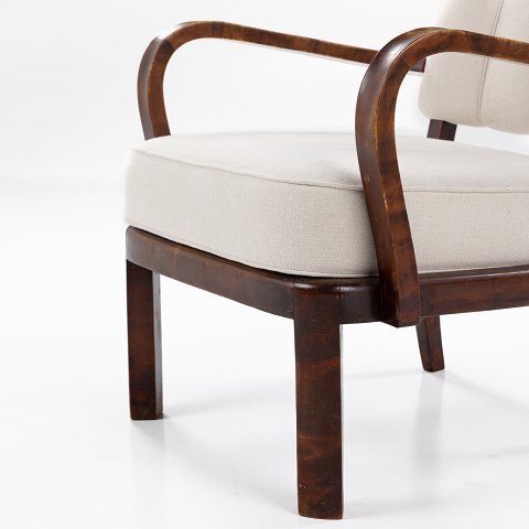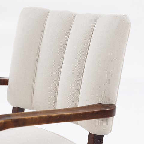 Lænestol i bejdset birketræ med ryg og sæde i lyst uldbetræk.