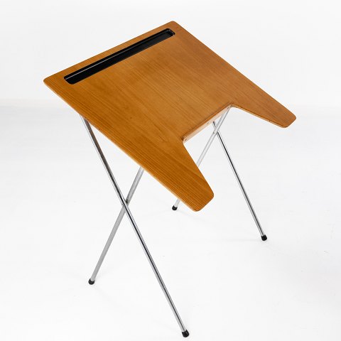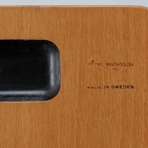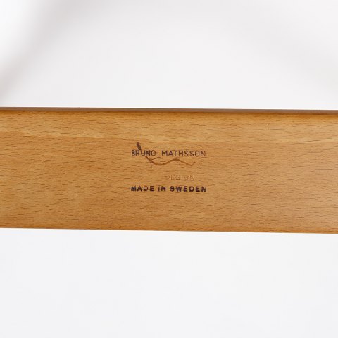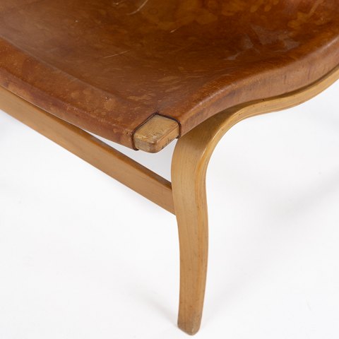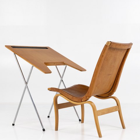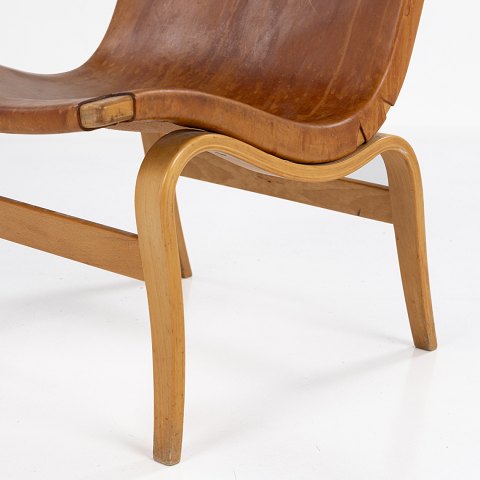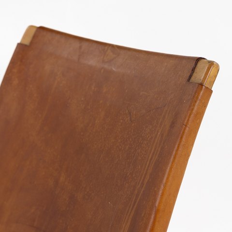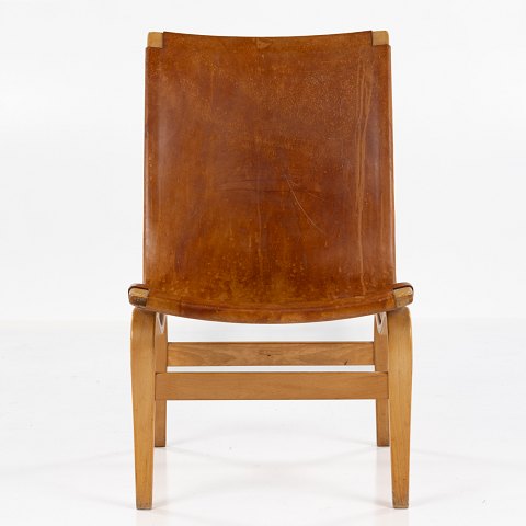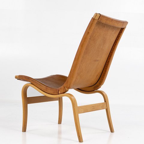 Lænestol (model Eva) i patineret bøg og kernelæder m. læseklap. Mærket fra producent.