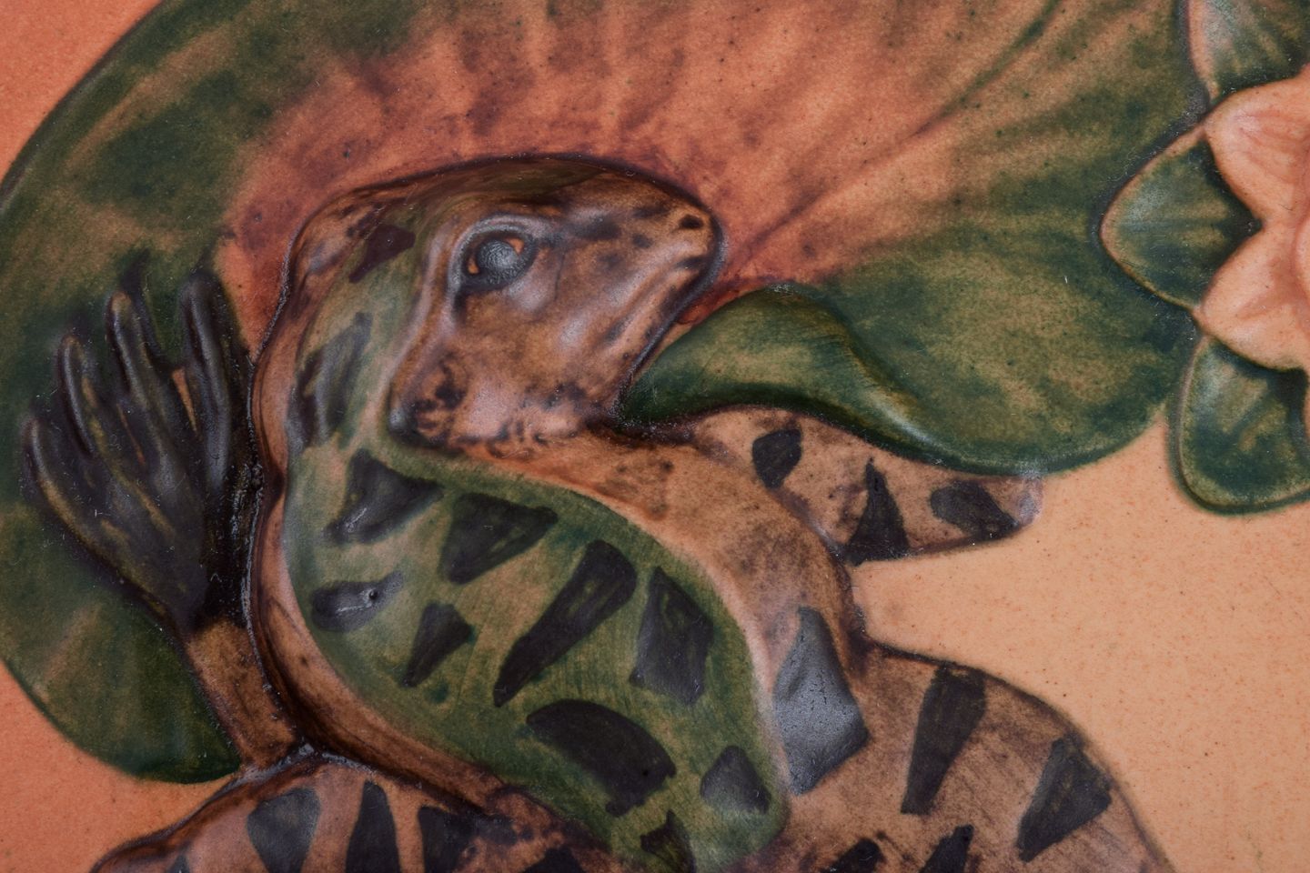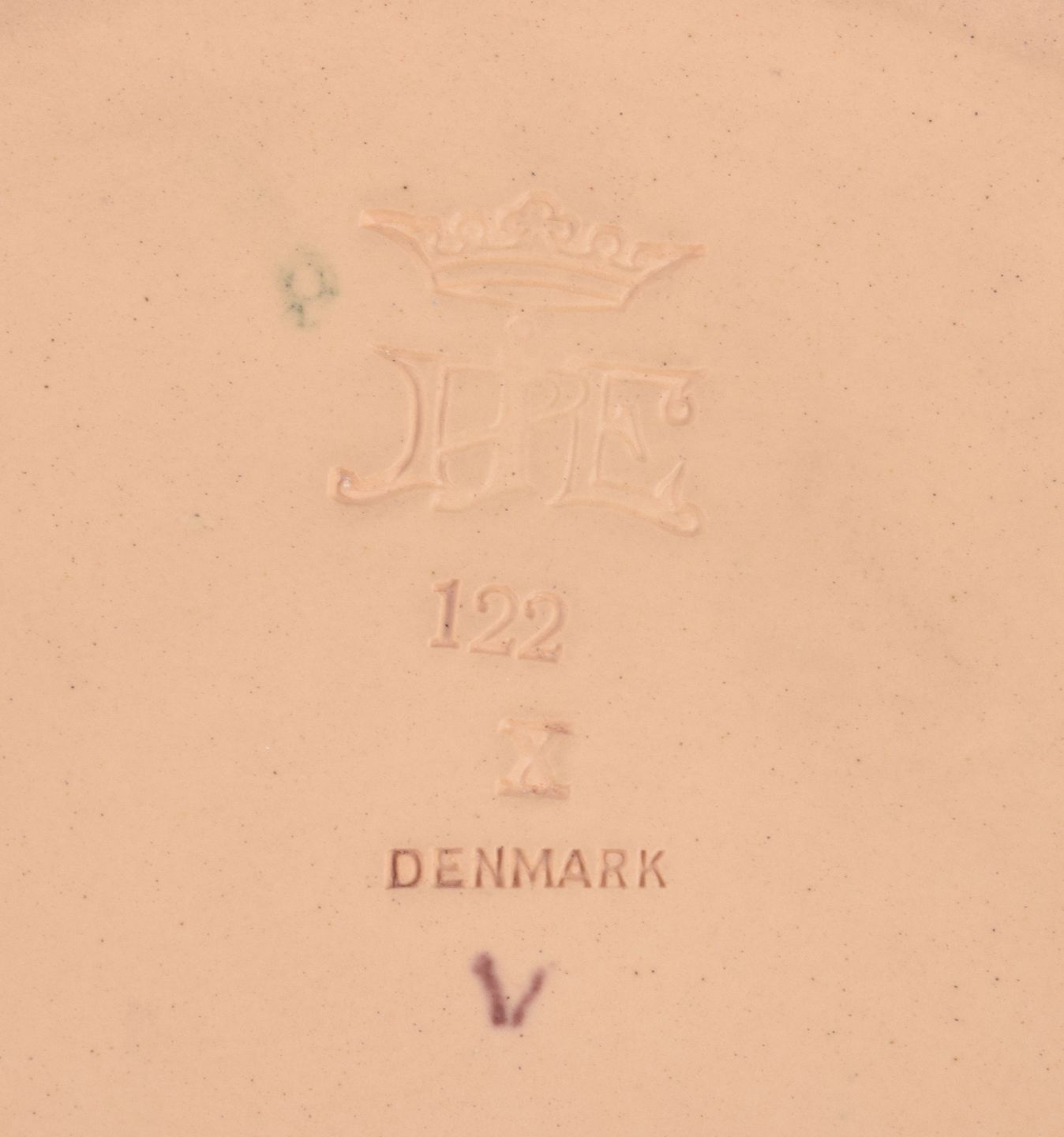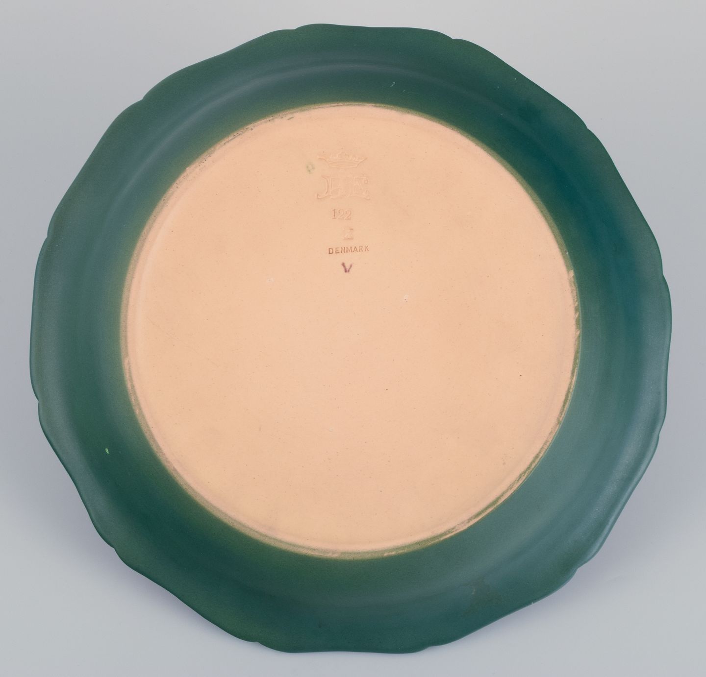 Ipsens Enke, Danmark. Cirkulært fad med frø i håndmalet glaseret keramik.