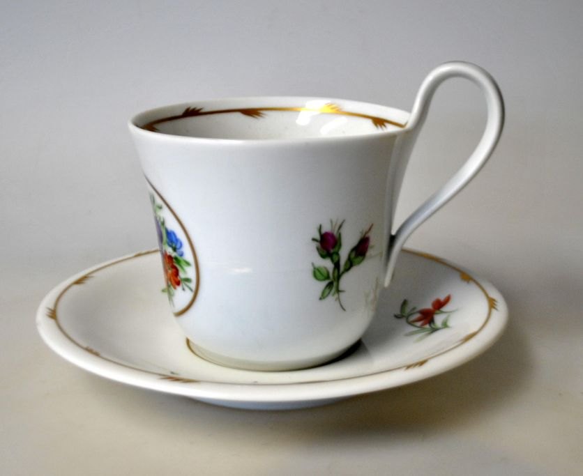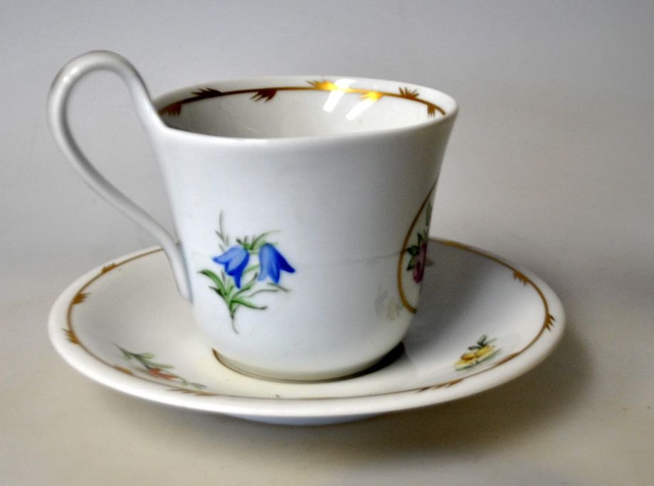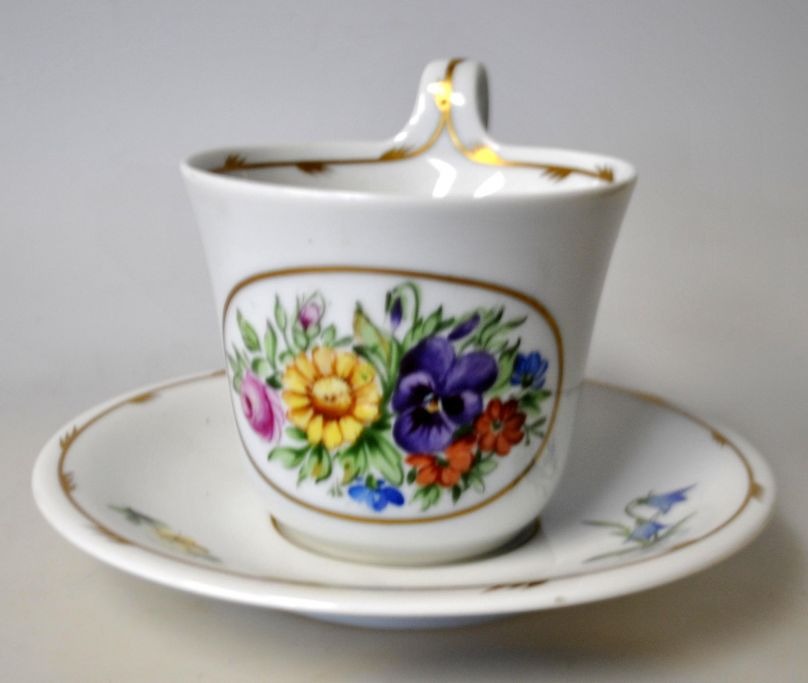 Coffee cup with high handle, Bing & Grøndahl, 19th century, Copenhagen, Denmark. Included saucer. With hand-painted floral decorations and gilding. With saucer. Stamped. Cup height: 9.5 cm. Dia. saucer: 15.5 cm.