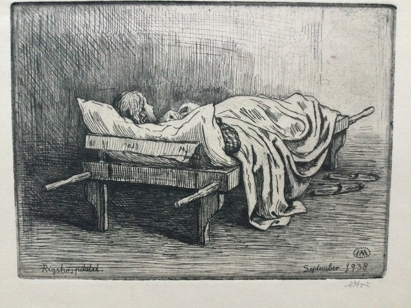 Radering af Axel Hou 1938 - Pigen på båren, Rigshospitalet.