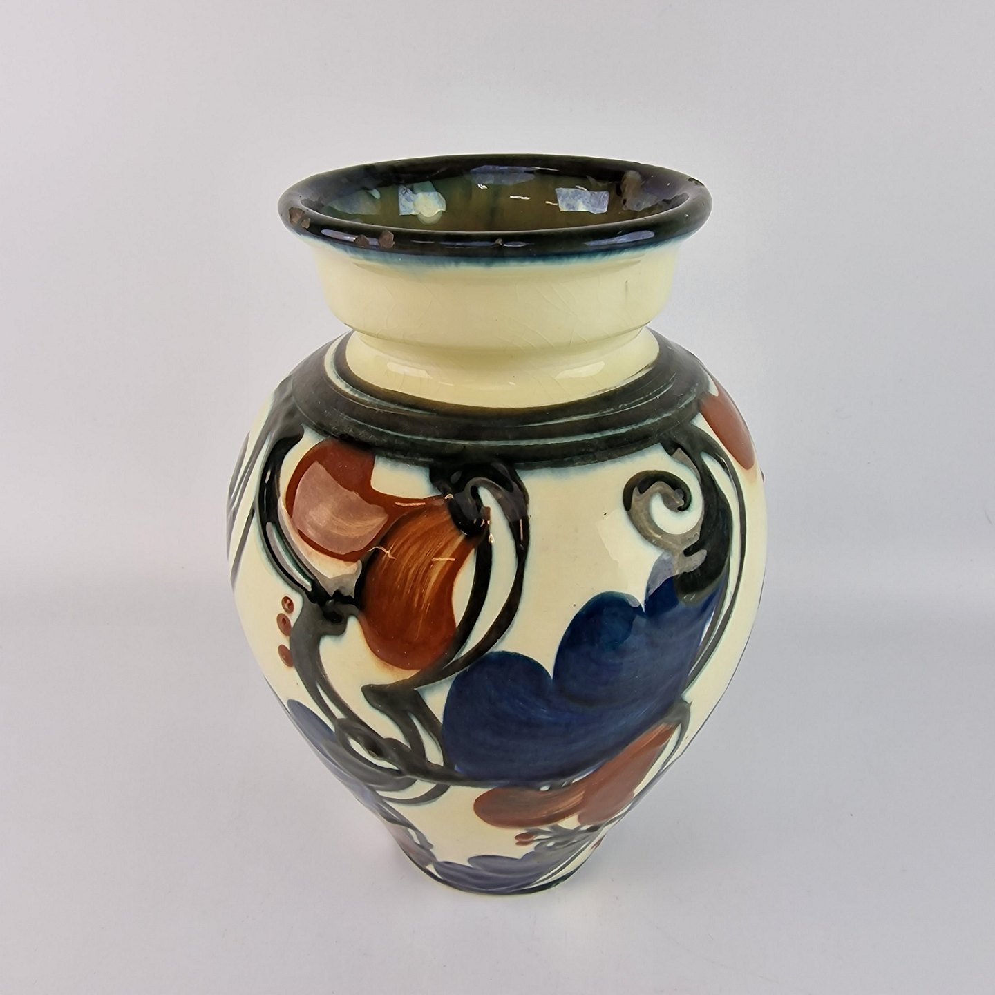 Vase med mørk glasering indeni og mønster med blå og rødbrune blomster udenpå