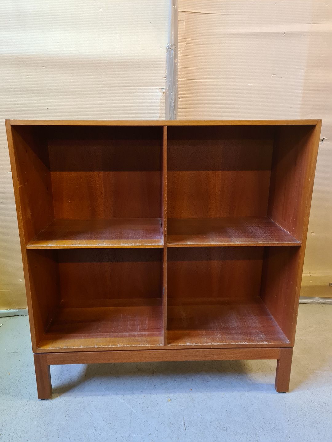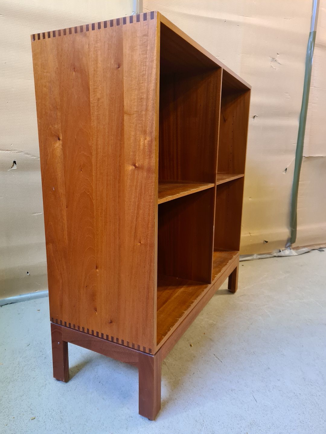 Reol i massivt mahogni, fra 1980-1990erne.