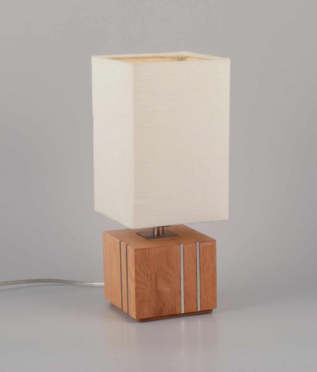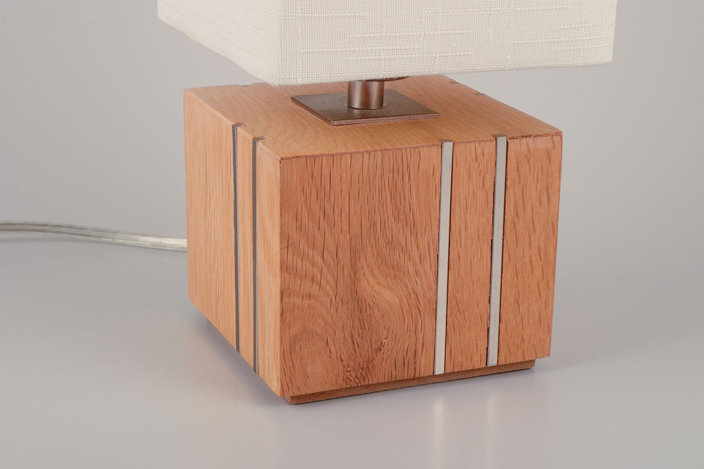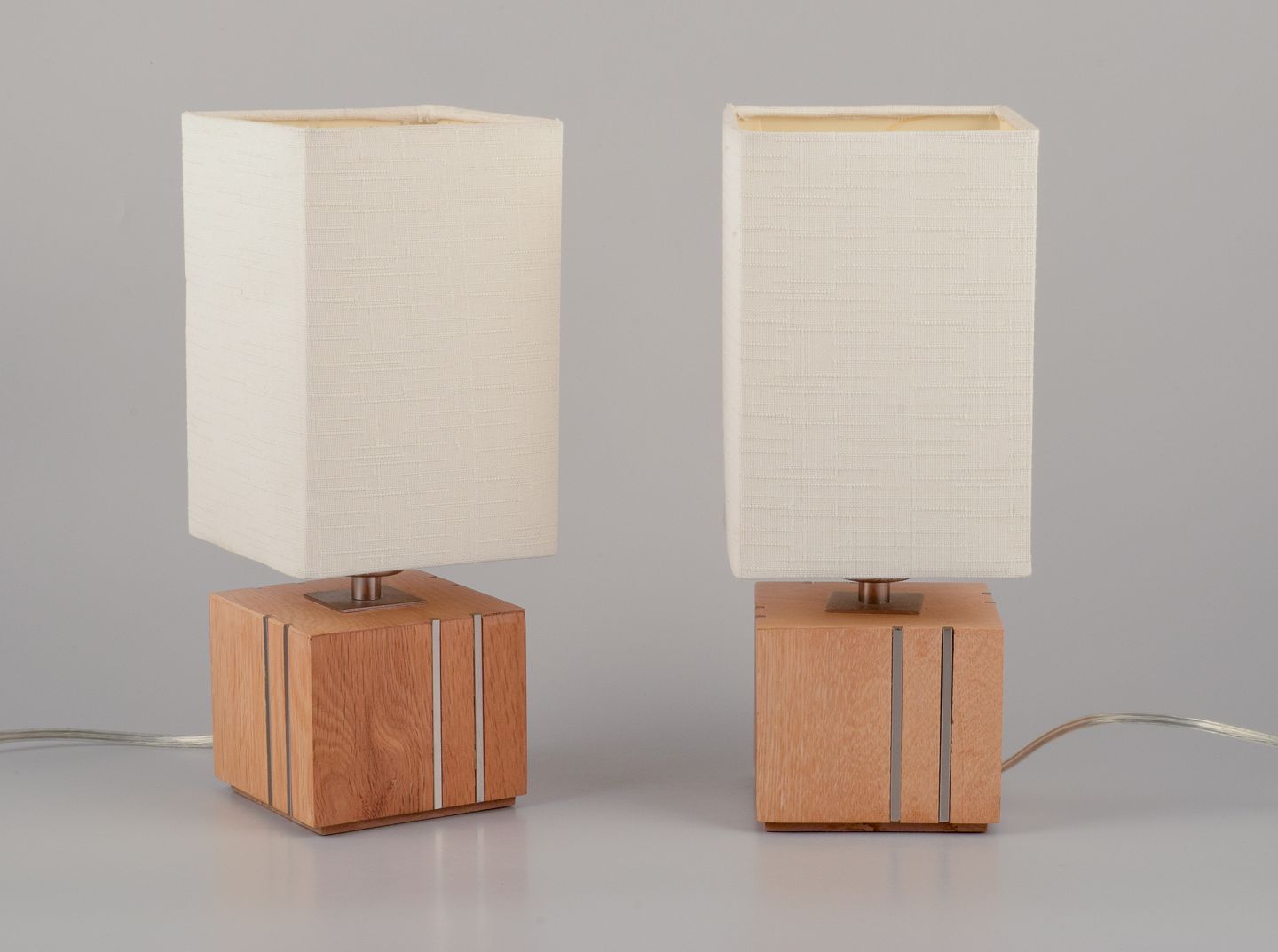 A pair of table lamps in light wood inlaid with steel, textile shade.