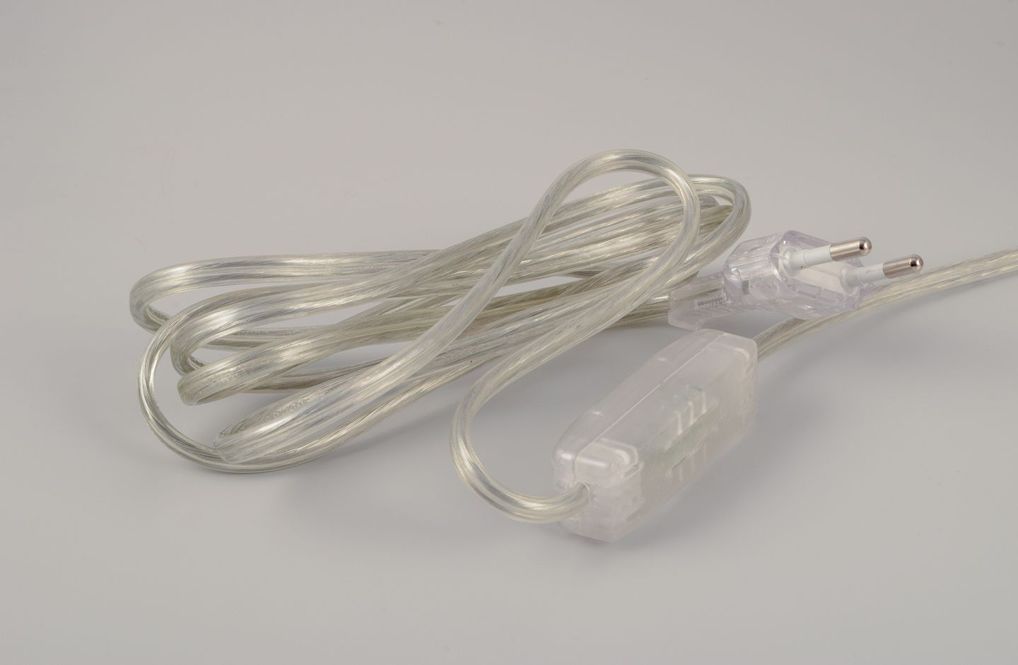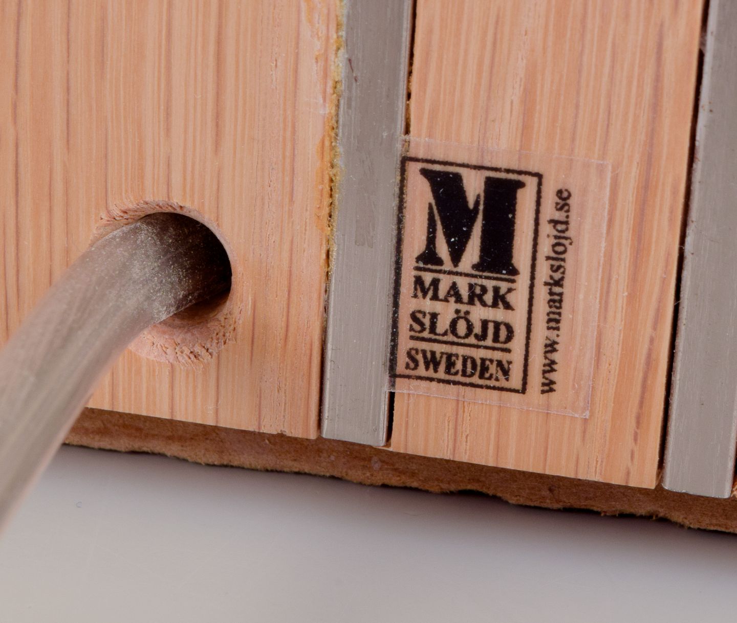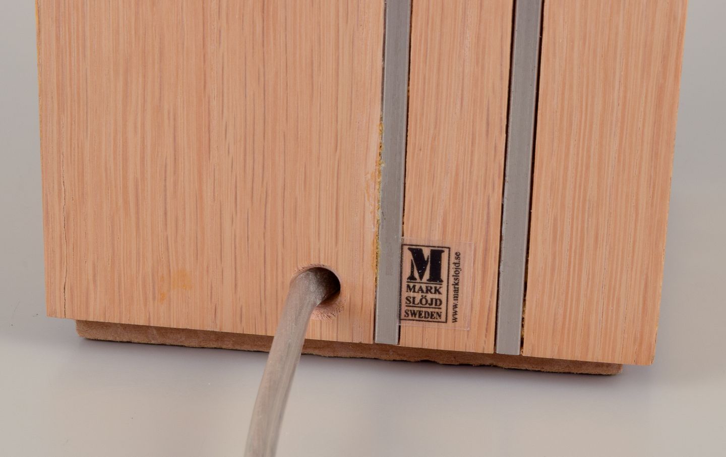 A pair of table lamps in light wood inlaid with steel, textile shade.