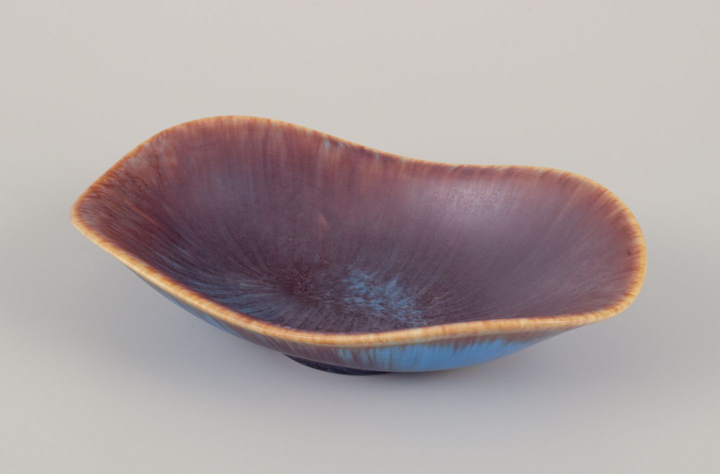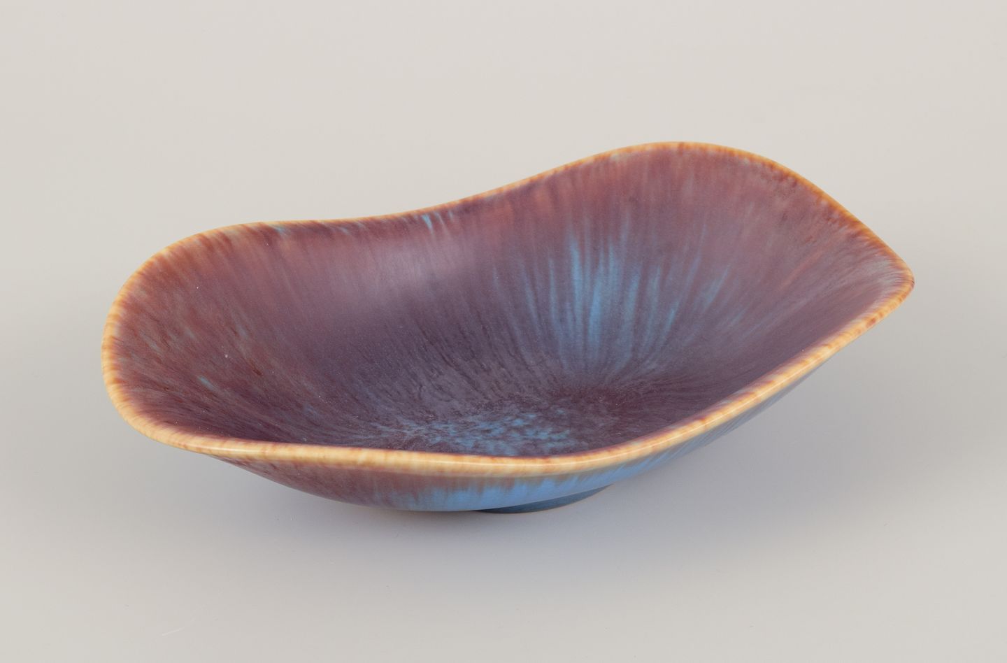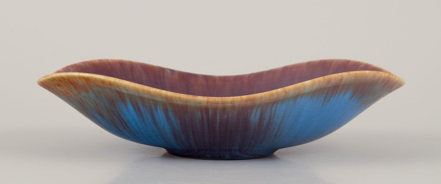 Aflang keramikskål, glasur i blåbrune nuancer.