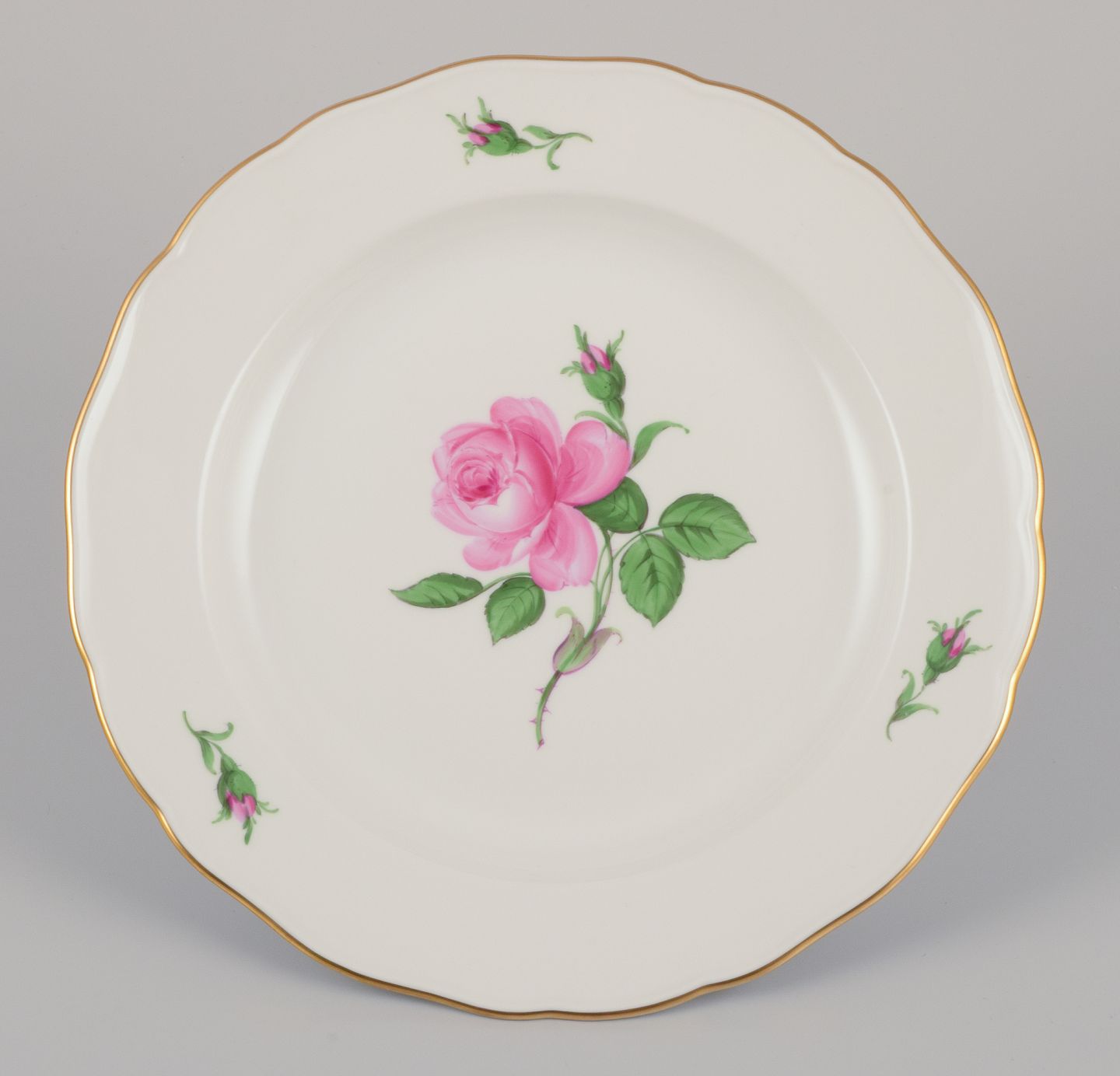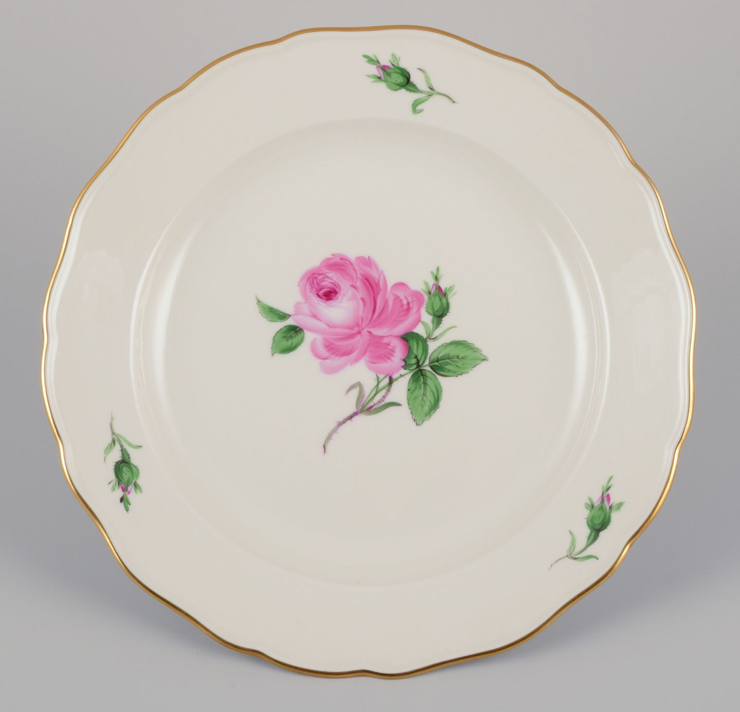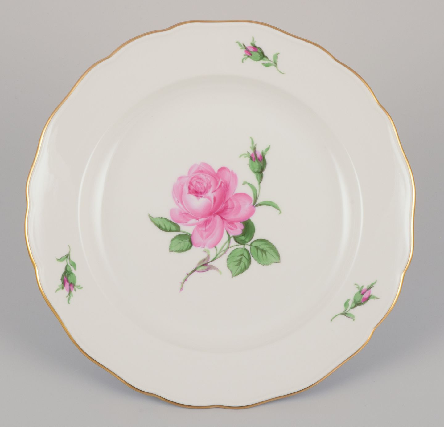 Meissen, Tyskland. Fire middagstallerkner med motiv af lyserød rose.