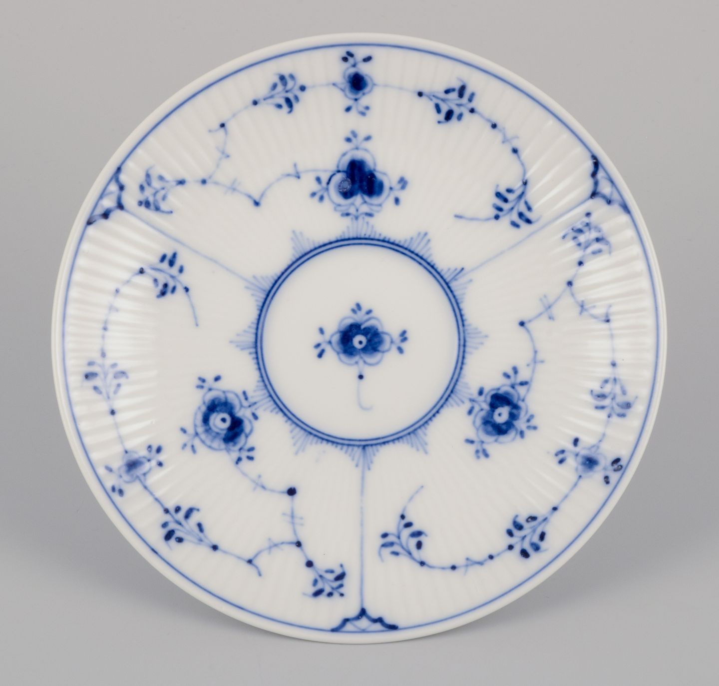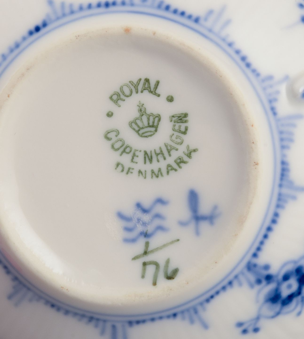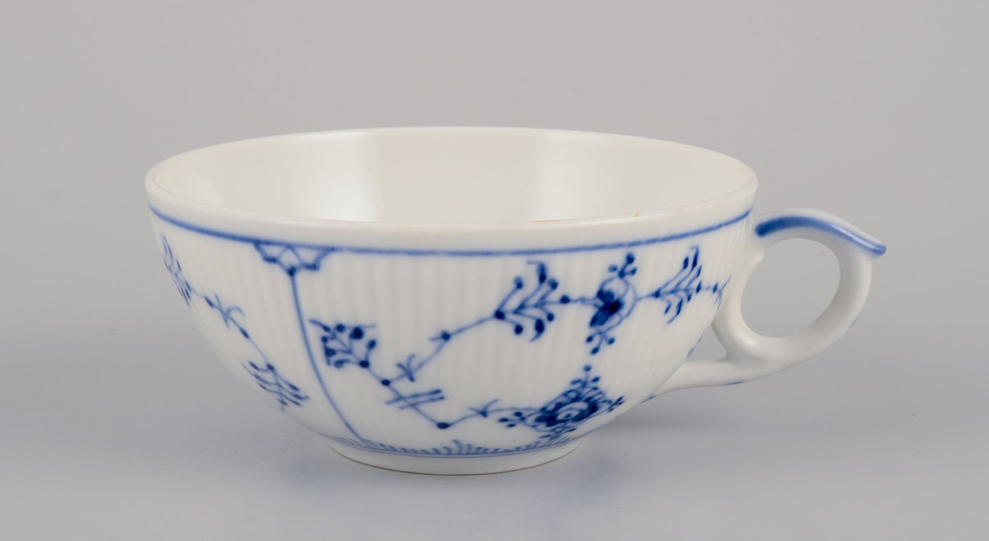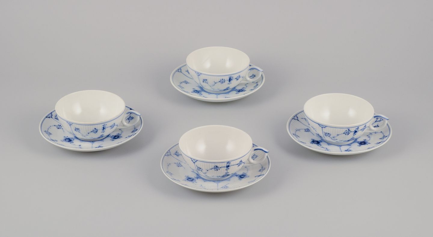 Royal Copenhagen Musselmalet Riflet. Et sæt på fire tekopper med tilhørende underkopper.