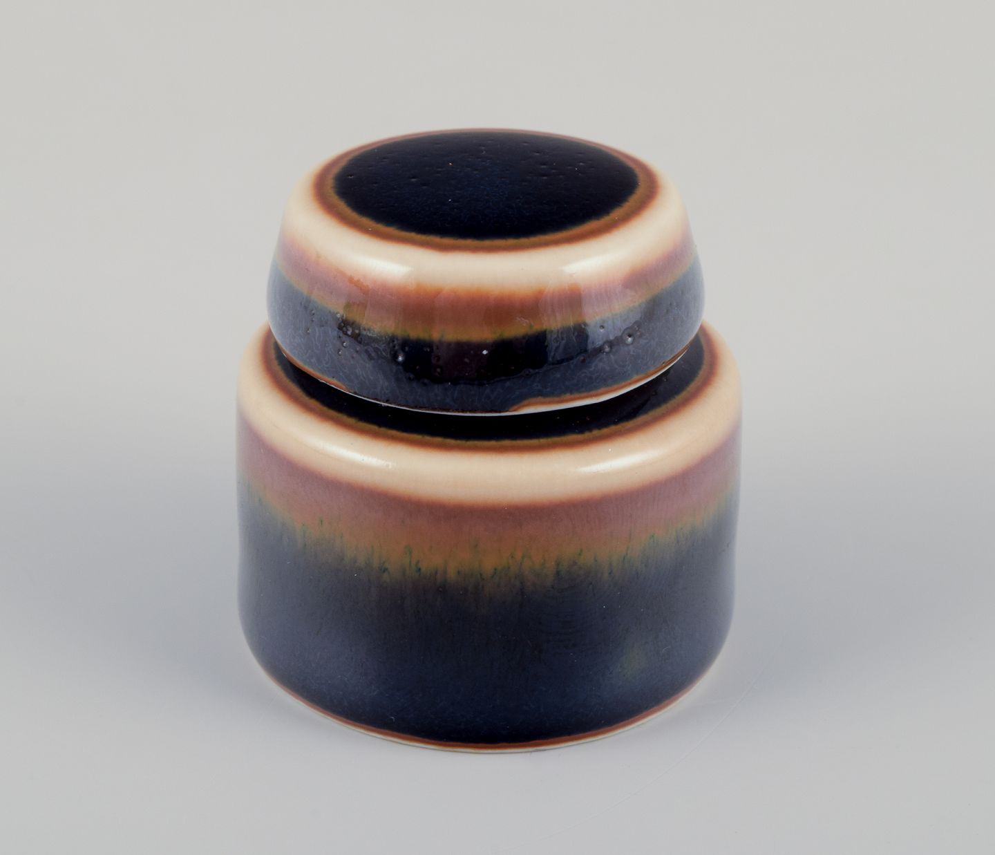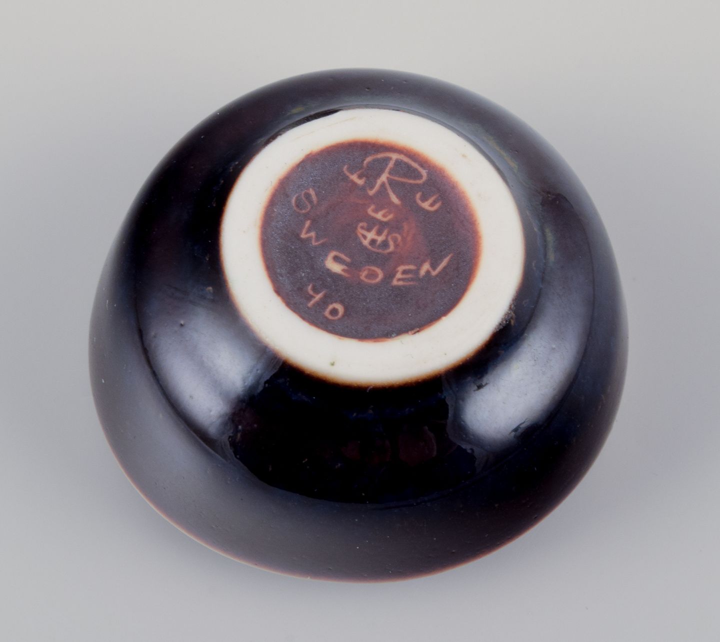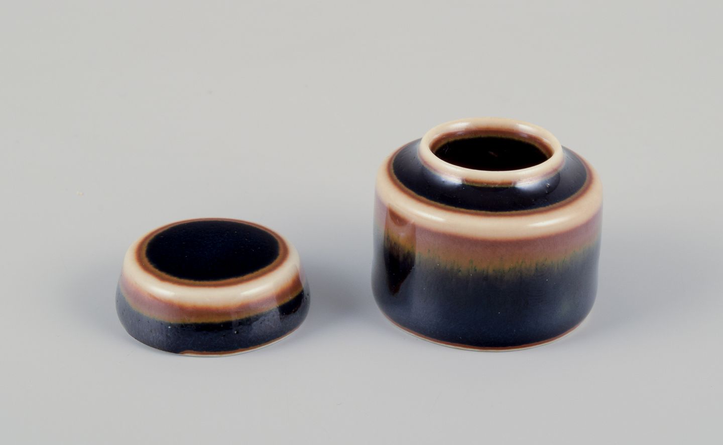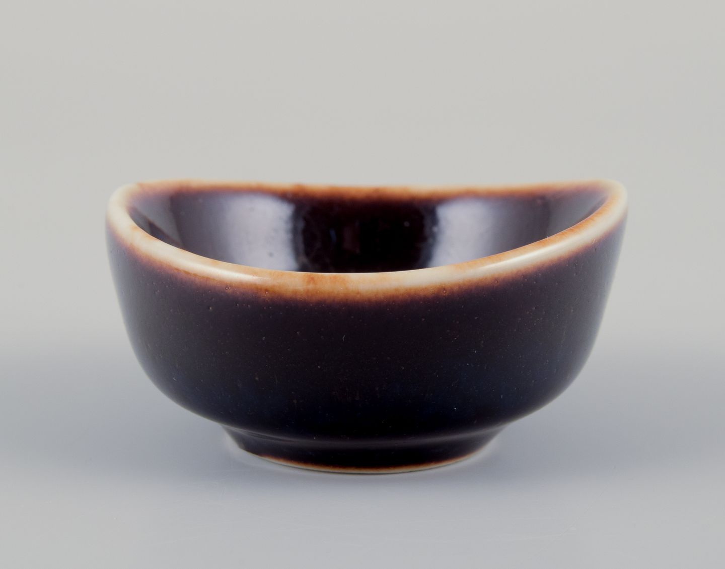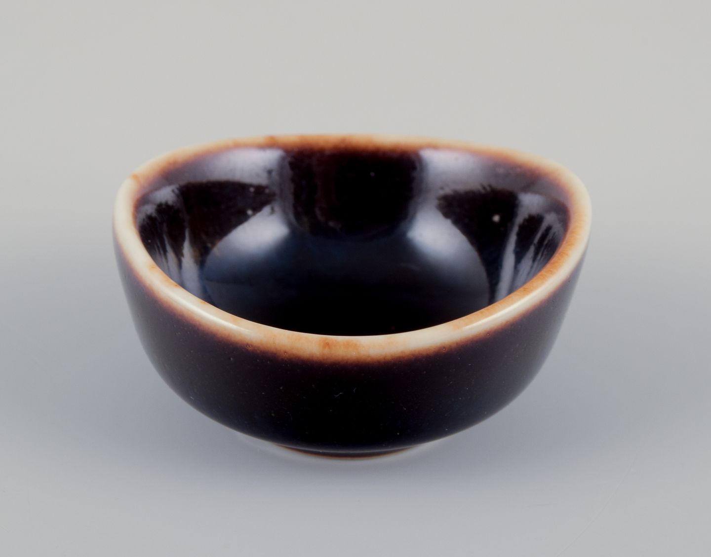 Miniature skål og miniature lågkrukke i keramik. Glasur i brune nuancer.