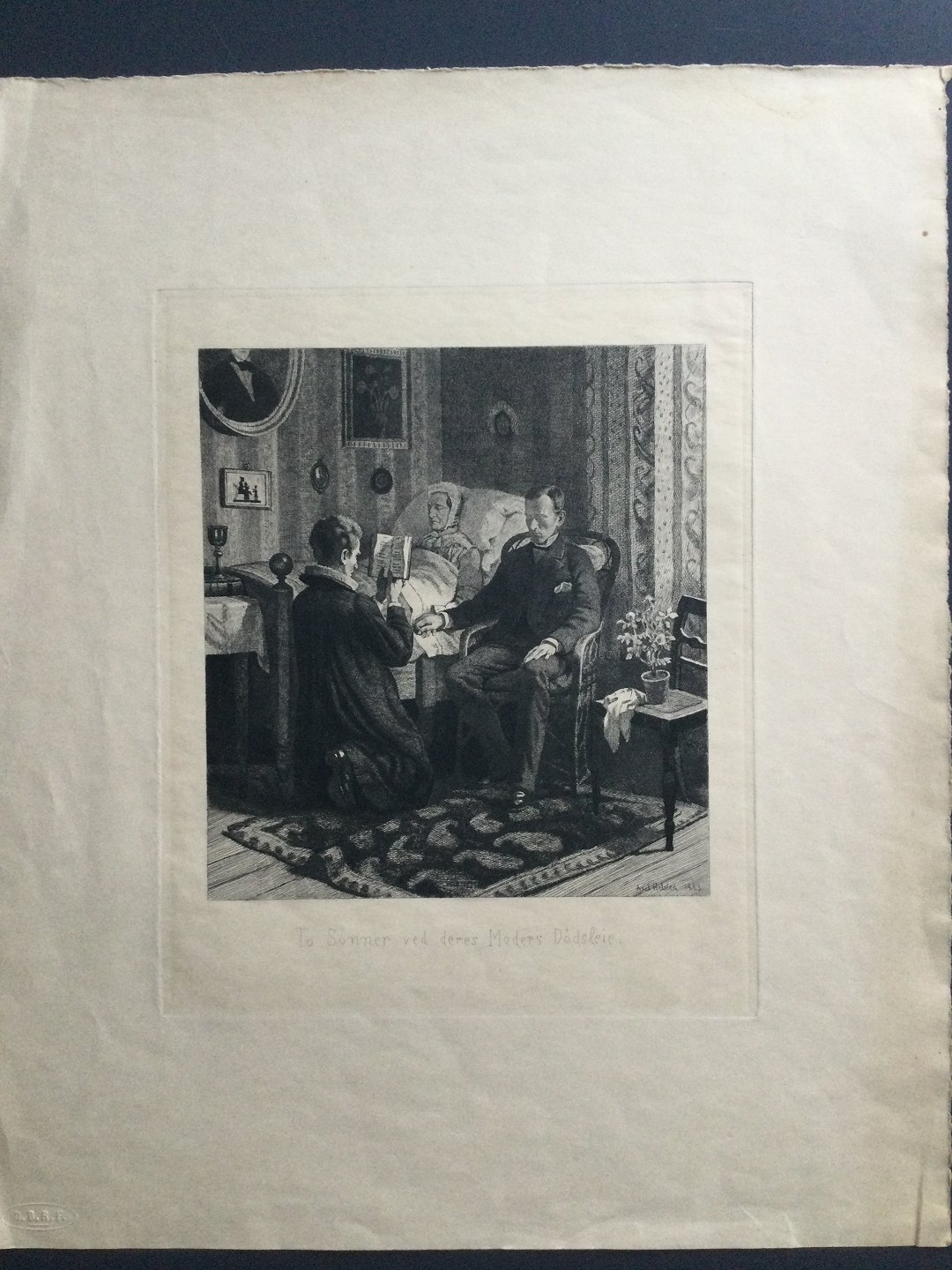 Radering Axel Helsted - To sønner ved deres mors dødsleje 1883.