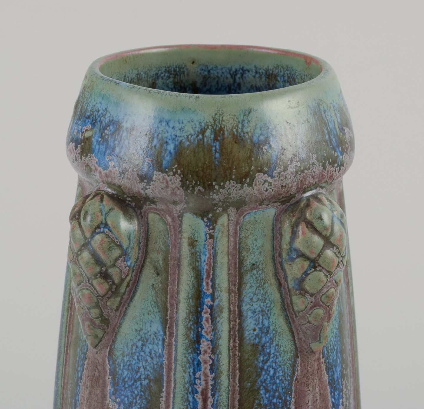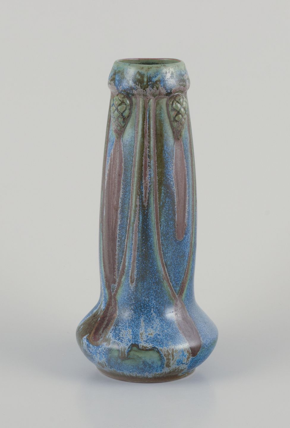 Fransk keramikvase med glasur i blå, grønne og brune nuancer.