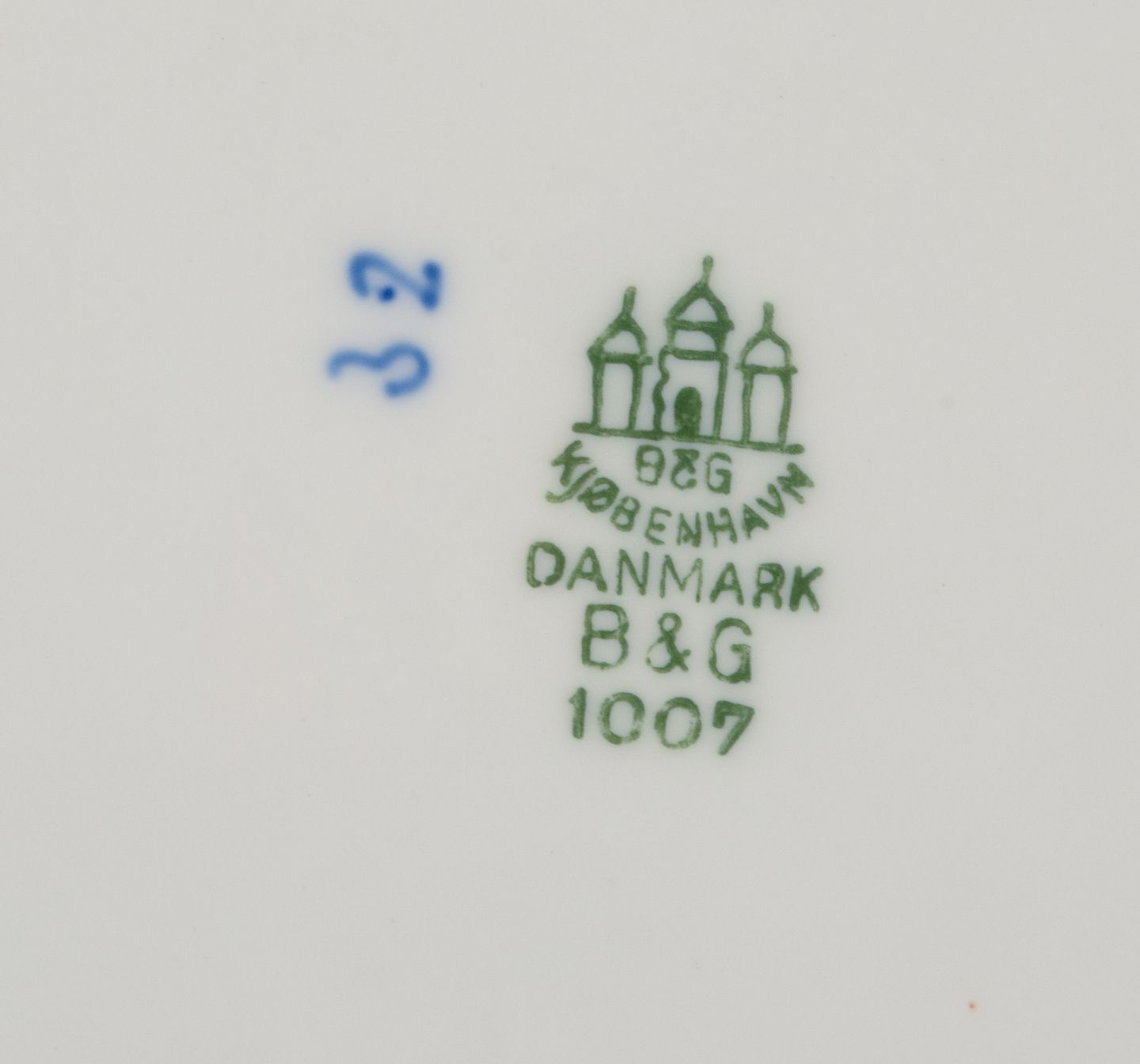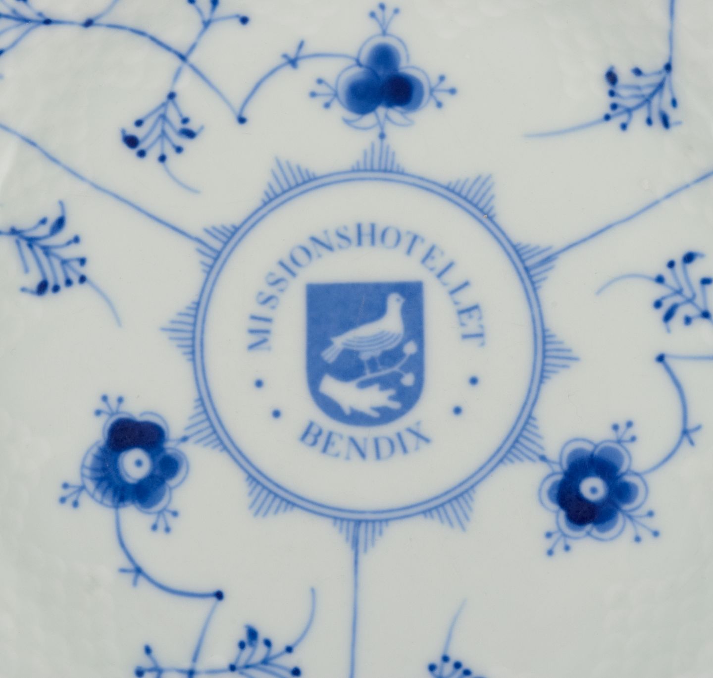 Et sæt på fem små Musselmalet frokosttallerkner i hotel/restaurantporcelæn.