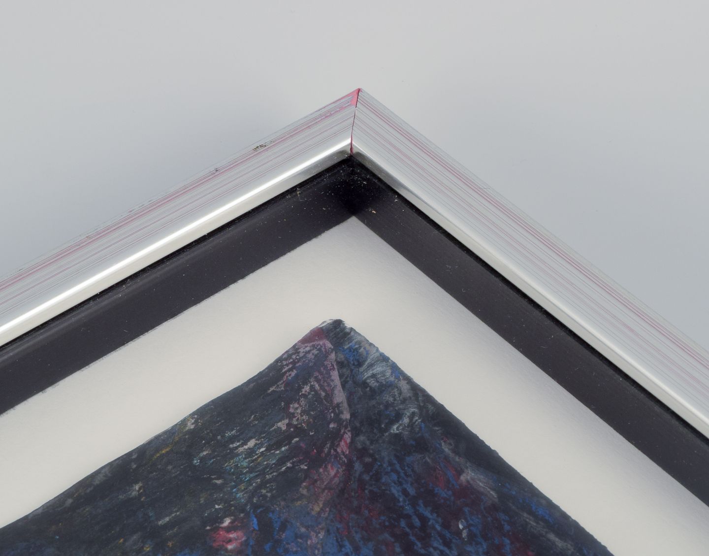 Billedet er bag glas i en ramme med distancelister.