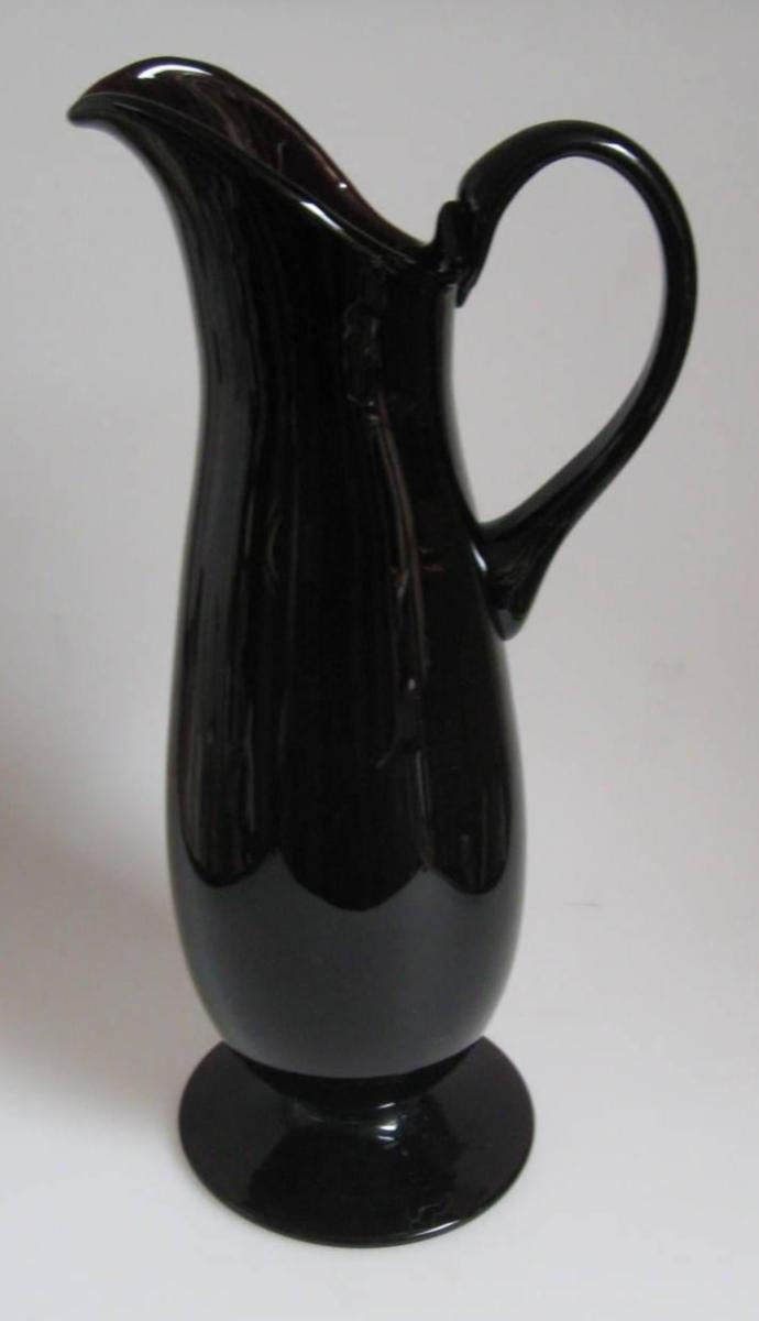 Holmegård kande, violet glas, 20. årh. H.: 34 cm. Rund fod med hank.