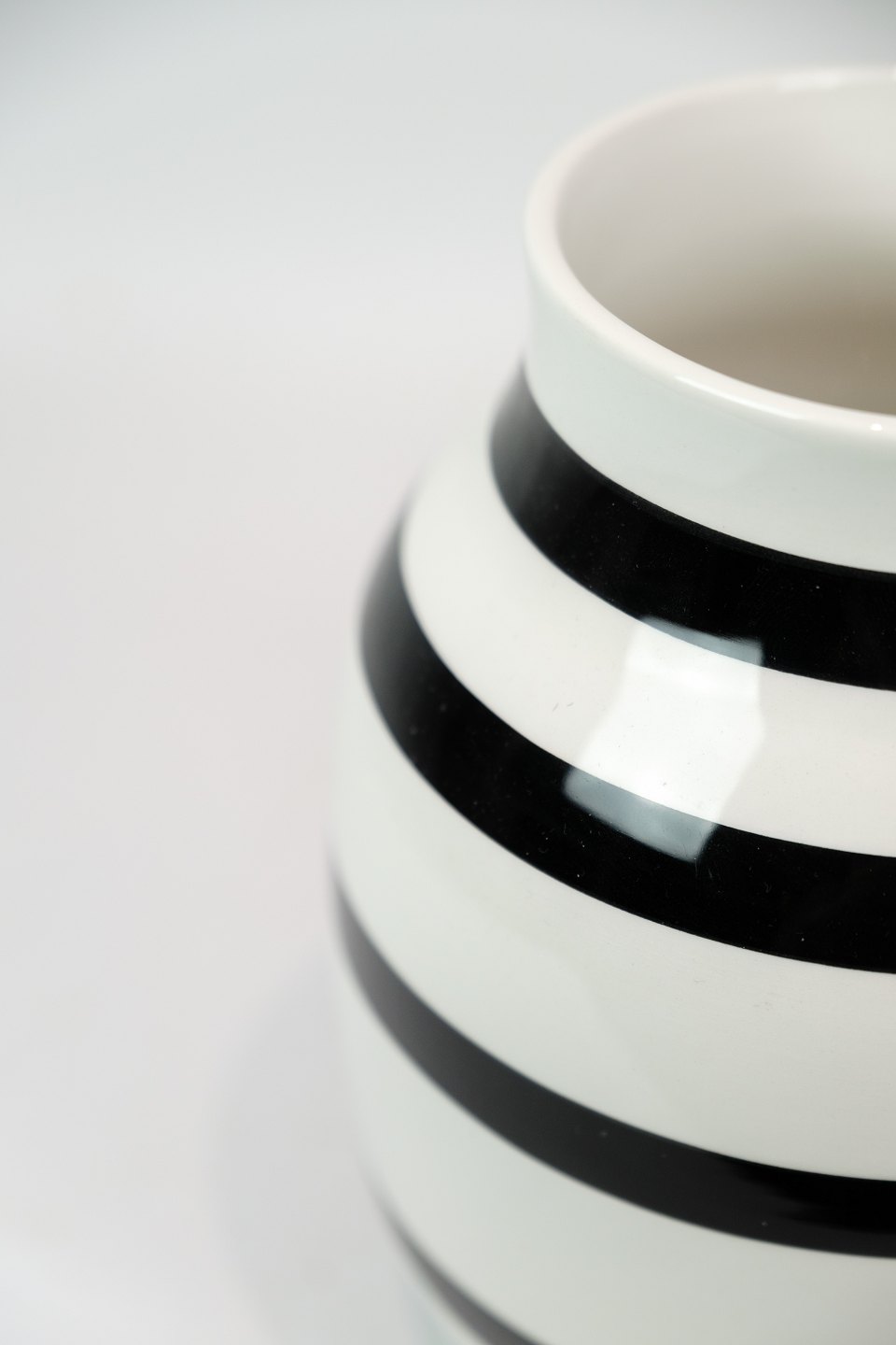 Kähler er en uundværlig favorit i utallige hjem takket være sit klassiske udseende og moderne design. Denne smukke vase, der er en del af en serie, passer perfekt til det skandinaviske hjem med sit enkle, men alligevel iøjnefaldende udtryk. Hver Kähler-vase i serien er håndmalet, hvilket betyder, at ingen to er helt ens. Den unikke charme og personlighed, der følger med variationerne i farve og bredde på striberne, gør hver vase til et kunstværk i sig selv. Tilføj et strejf af elegance og individualitet til dit hjem med en Kähler-vase, der vil pryde ethvert rum med sin skønhed og unikke karakter.
