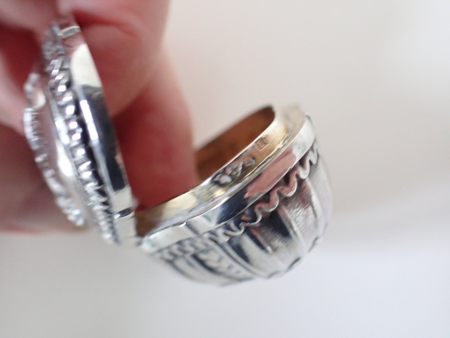 Lille rigt dekoreret fransk pilleæske i sølv med indvendig forgyldning. Ca.1820 Mester LG. Låget er dekoreret med pilekogger bladhang med oval til initialet. Sammenslyngede initialer JM. Kanter med riflet stileseret dekoration. Længde: 5,5 cm. Bredde: 3,7 cm. Dybde: 2,8 cm. Vægt: 23 gram. I fin stand - flot indvendig forgyldning.