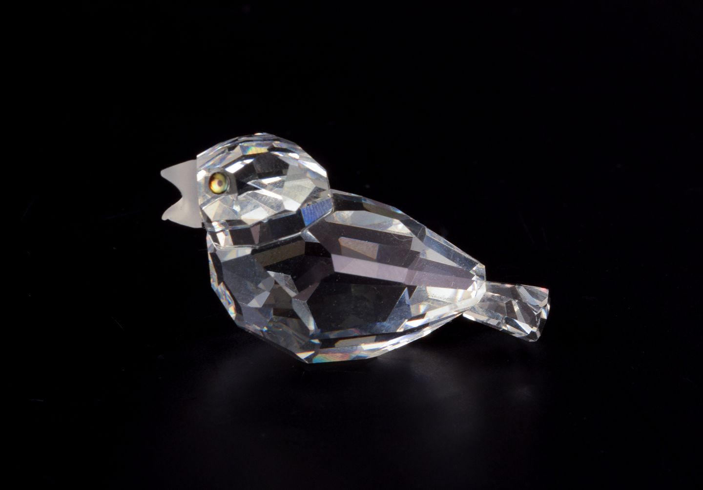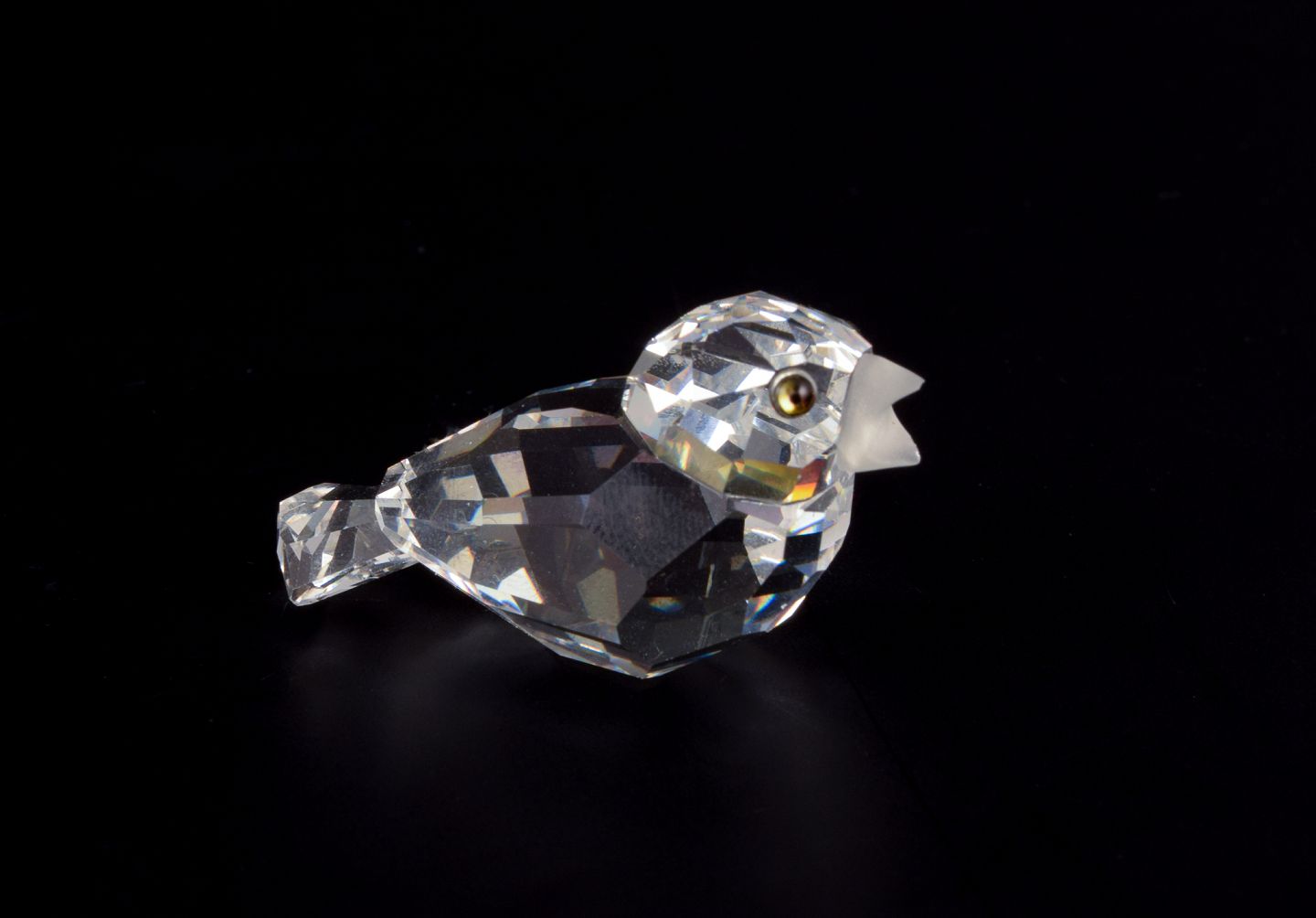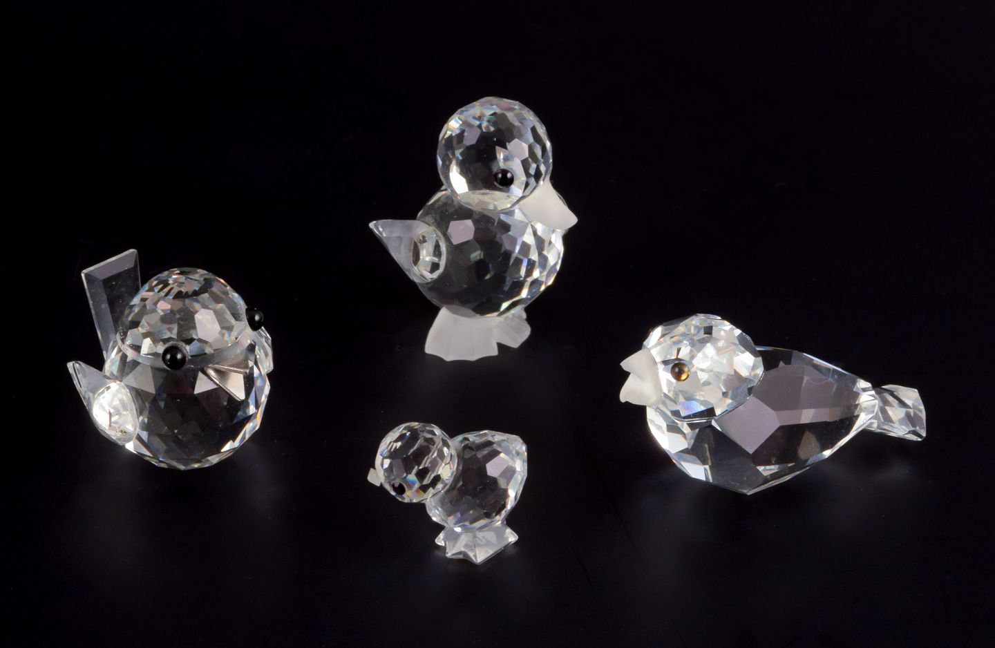 Fire miniaturefigurer af fugle i facetslebet krystalglas.