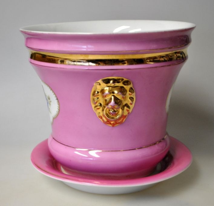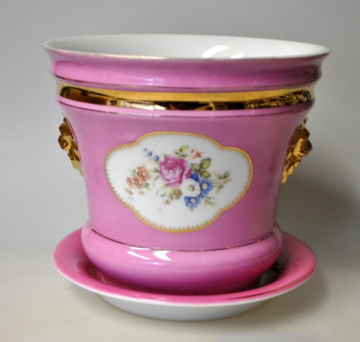 Lyserød urtepotte i porcelæn, C. Tielsch, Waldenburg - Altwassser, Tyskland (nu Polen) 1890 - 1914. Med underskål. Sider dekoreret med forgyldte løvehoveder. På siden endvidere blomsterdekorationer i oveføringsteknik - fremhævet med emaljemaling. Stemplet. H.: 16 cm.