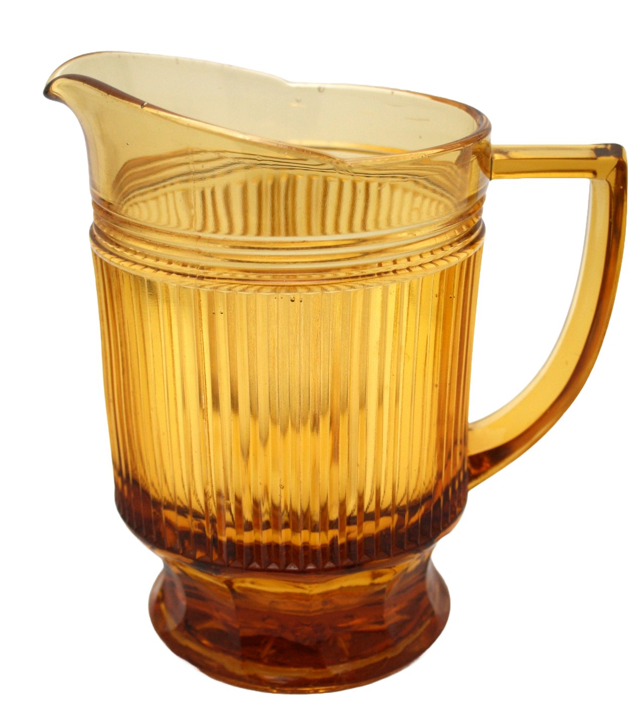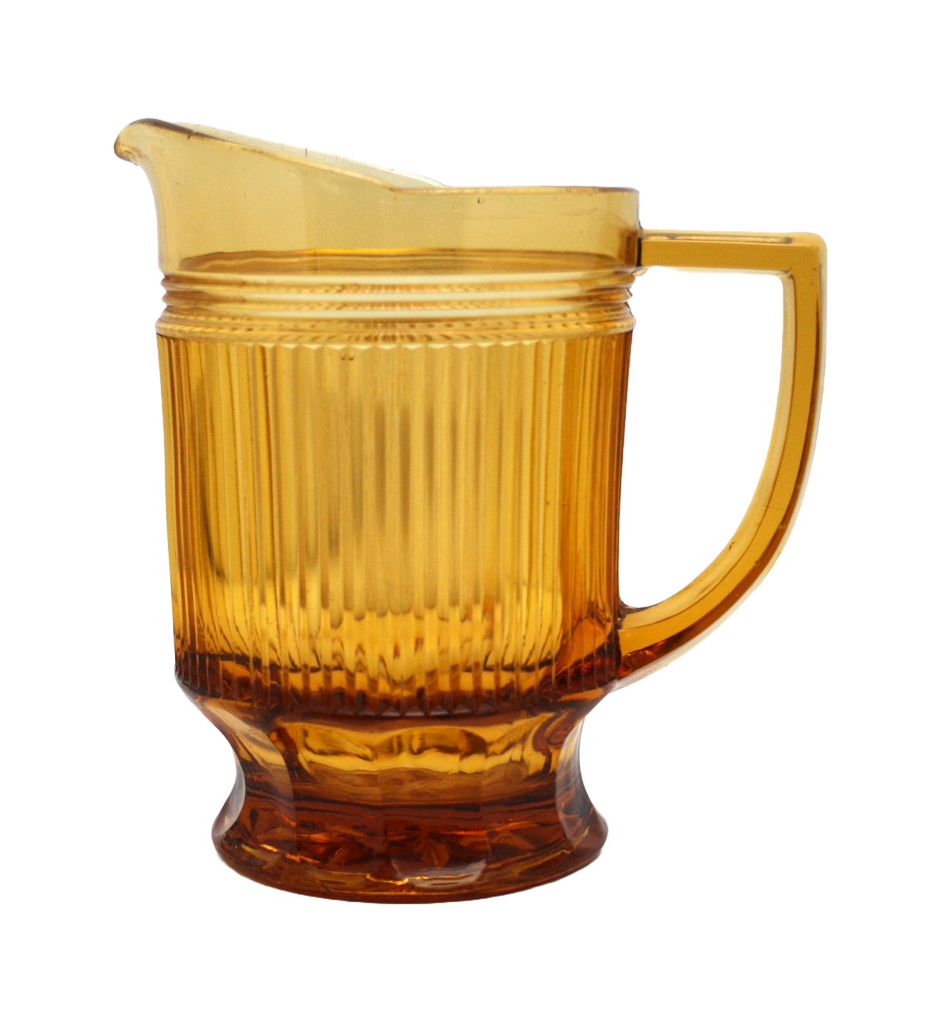 Holmegaard, Ravfarvet kande i presset glas. Designet af Jacob E Bang i 1938 sammen med matchende små stabelglas. Højde 18 cm. Længde 18 cm. Pris: 225 kr.