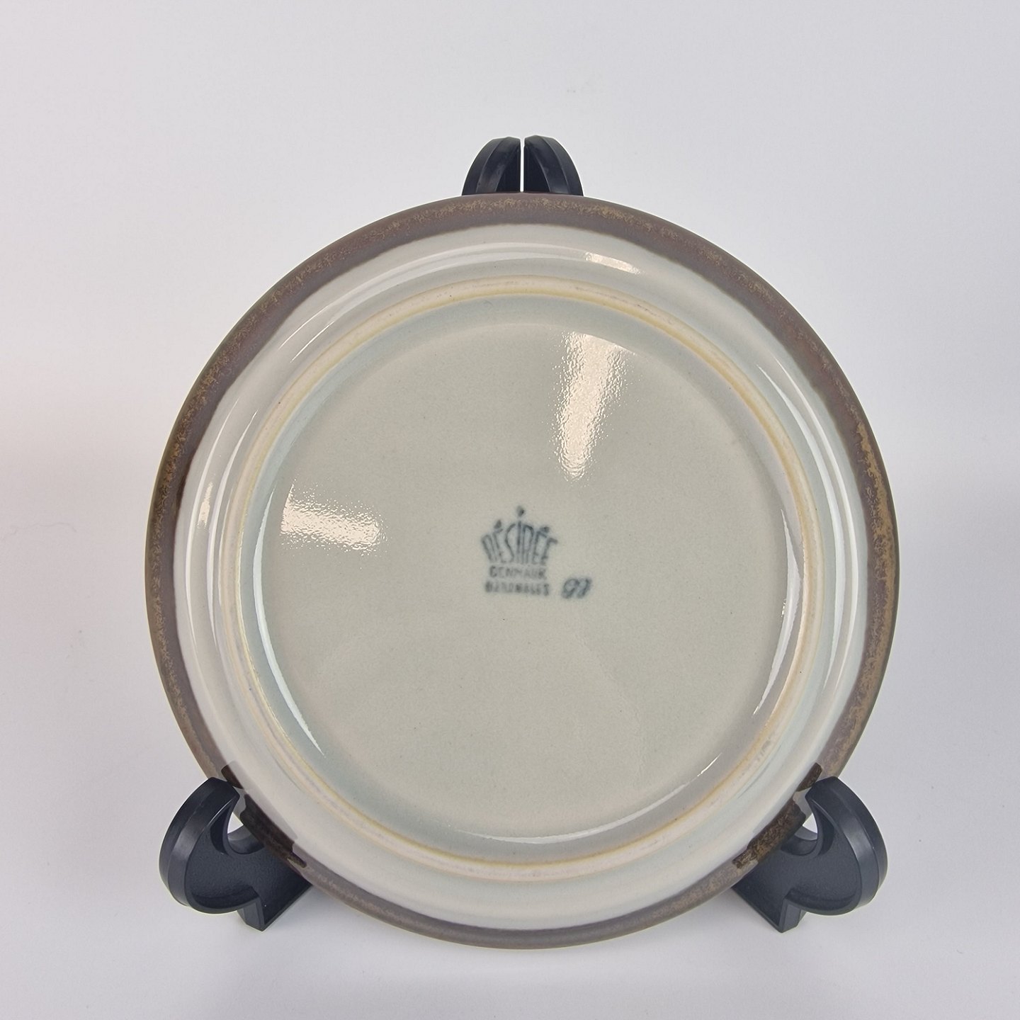 Diskos er af ovnfast stentøj. Stellet er gråt og håndmalet med brune og grønlige detaljer