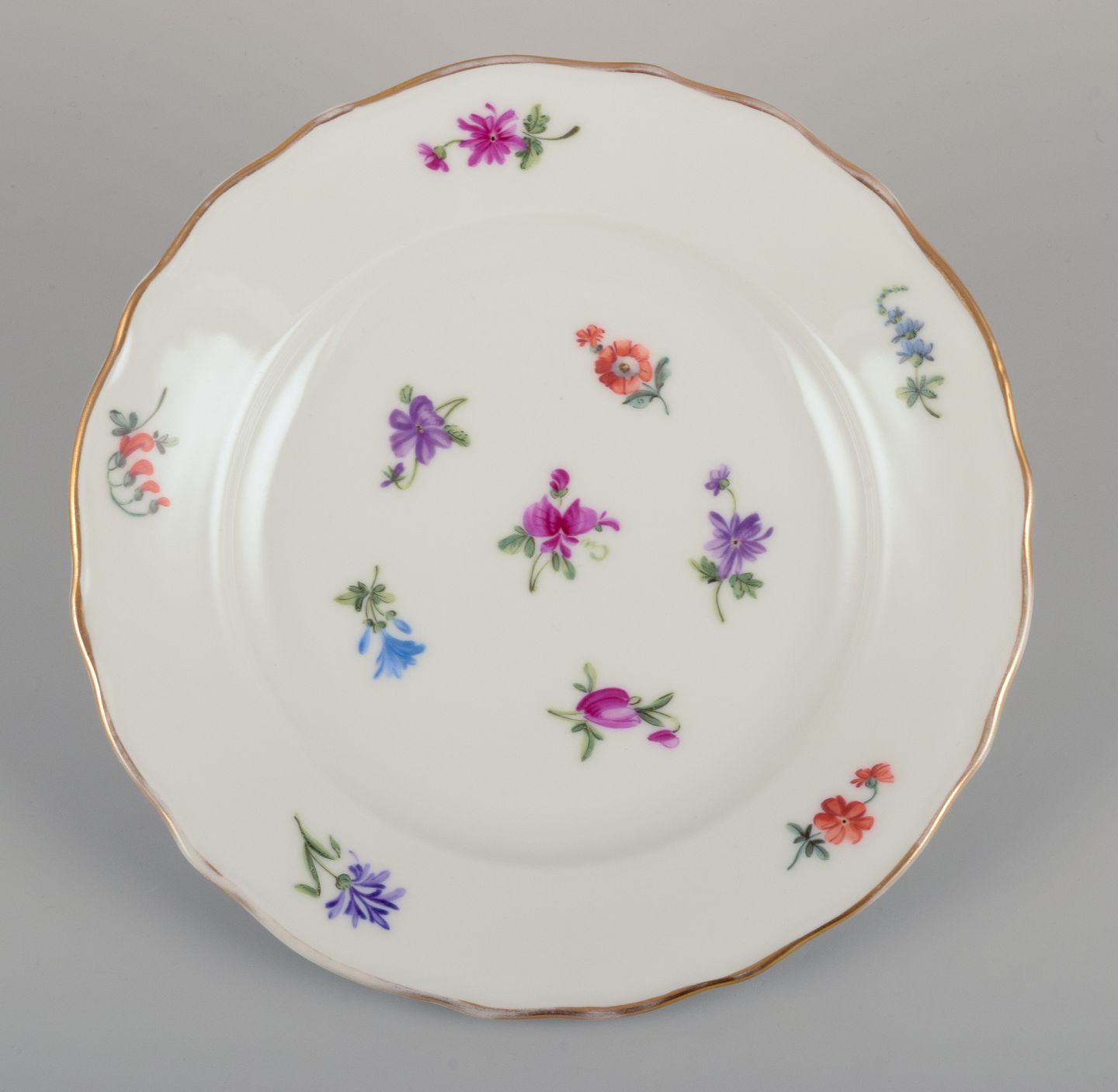 Håndmalet med blomstermotiver i polykrome farver, guldkant.