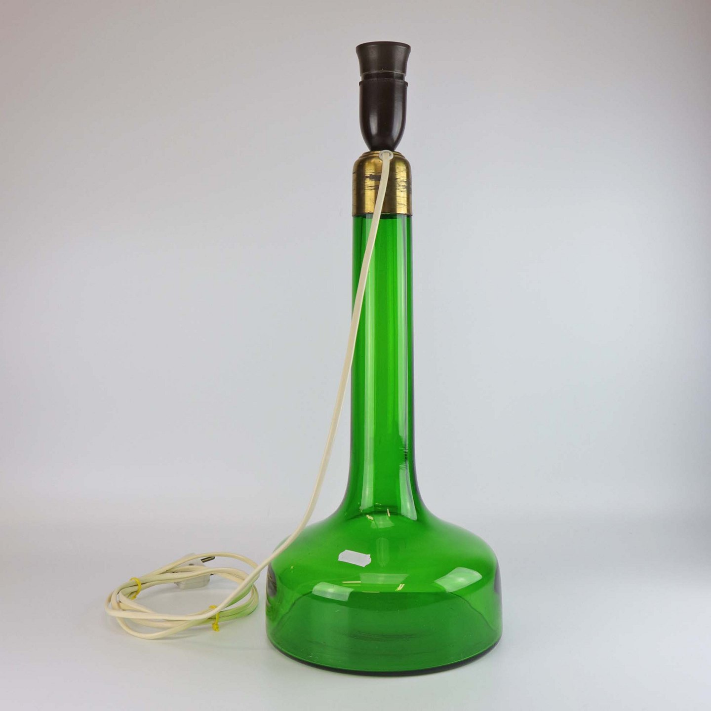 Bordlampe med fod i grønt glas med top i messing.