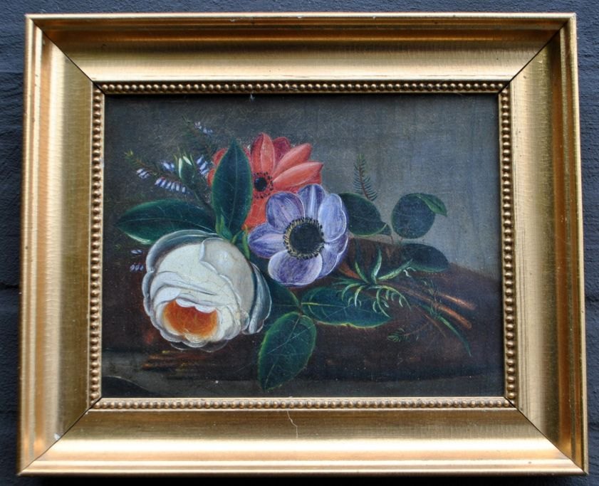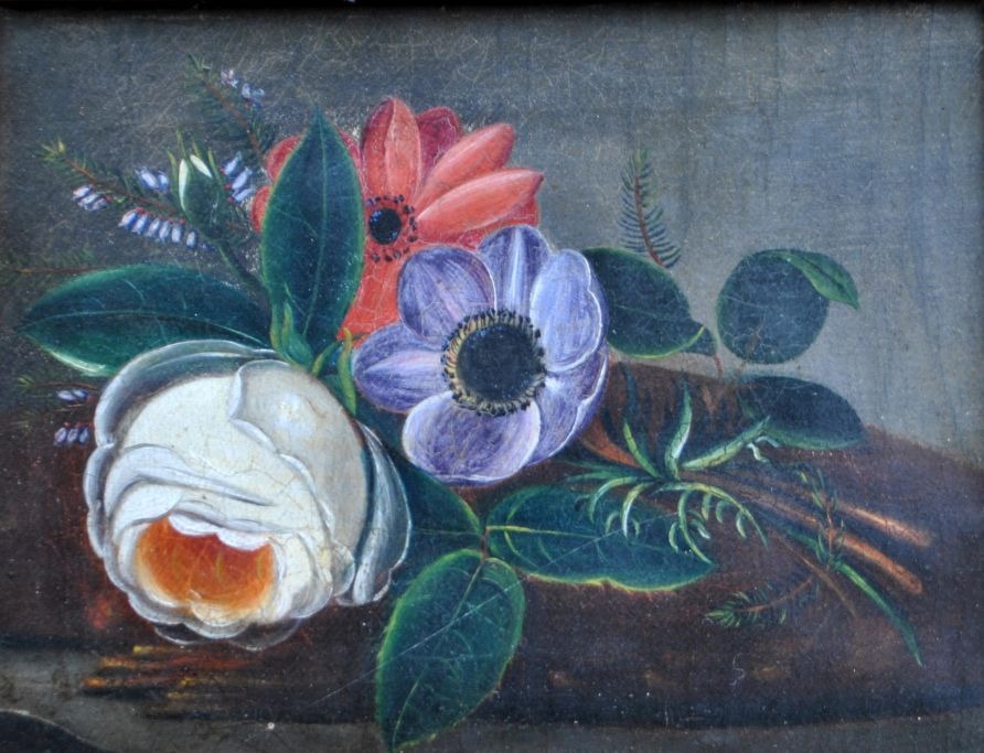 Dansk kunstner (19. årh.): Opstilling med blomster. Olie på lærred. Usigneret. 17,5 x 23 cm.