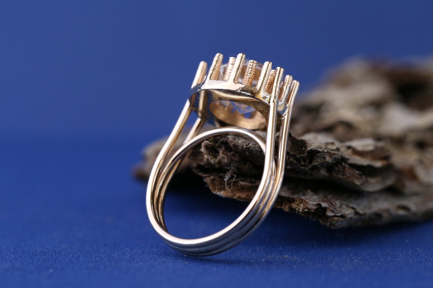Eksklusiv og fyldig damering i 14 karat guld, med virkelig high-class niveau. Ringens fysiske fremtoning er så elegant, at man straks får lyst til at kigge nærmere på den. De buede former, der der ender i en "krone" på toppen af ringen, er et meget elegant design.