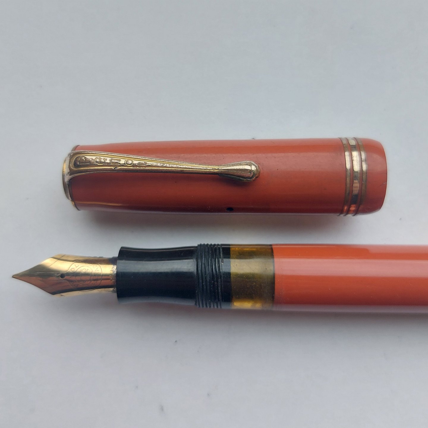 Koralrød Penol de Luxe fyldepen. Push button blækpåfylder. Virker ikke. Der skal indsættes ny gummisæk før end den igen kan optage blæk og skrive igen. Har et par ridser ved hætte åbningen. Ridserne er ikke nennemgående. Alle dele originale Penol dele. Der kan indsættes ny gummisæk for kr. 200,- fyldepennen er 12,7 cm lang.