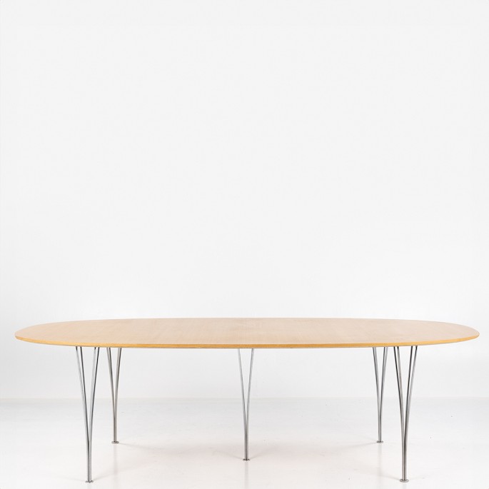 Superellipsebord med plade i bøg og spændben af stål.