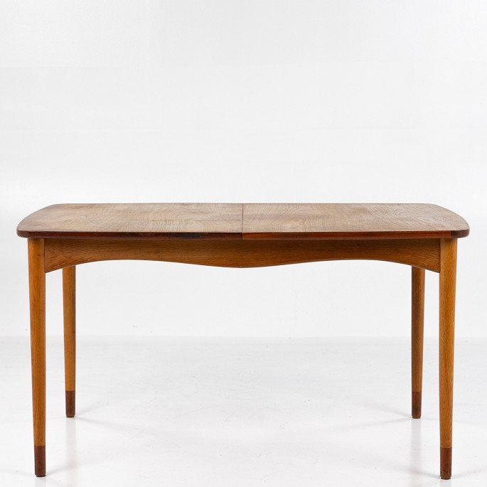 Spisebord i teak og eg med to tillægsplader. Tillægsplader tilføjer 96 cm extra.