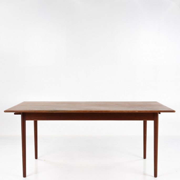 Spisebord i teak med to tillægsplader. Tillægsplader tilføjer 90 cm ekstra i alt.